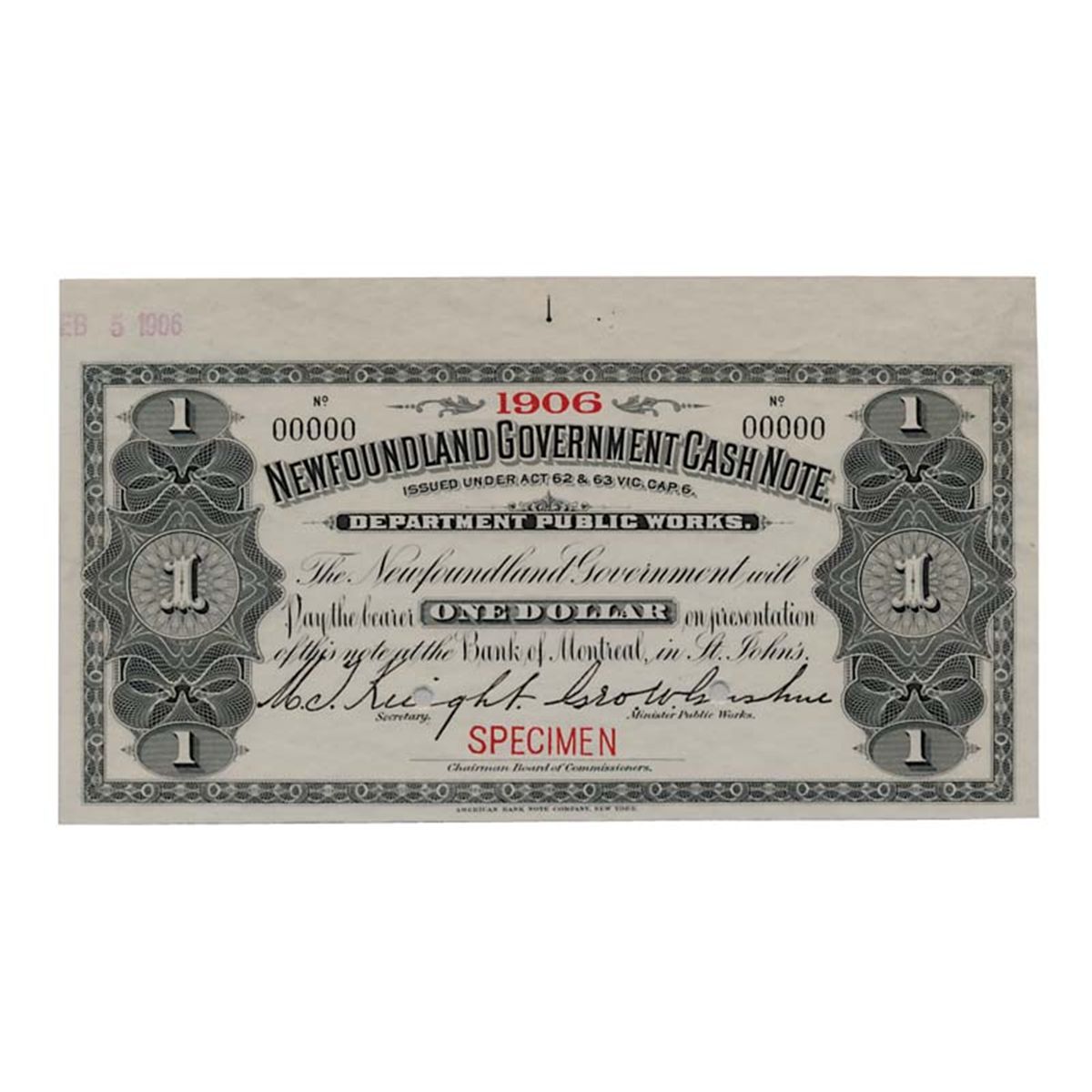 Newfoundland Government Cash Note. $1.00. 1906. NF-5fS. Specimen. PMG Superb Gem Unc-67 EPQ.
