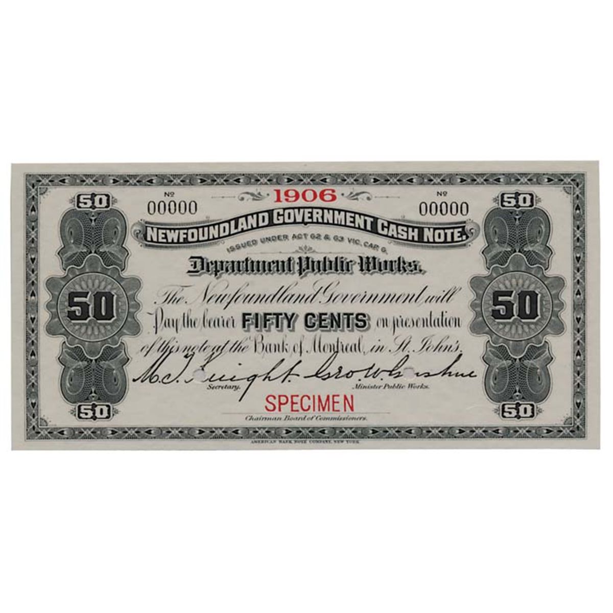 Newfoundland Government Cash Note. 50 Cents. 1906. NF-3fS. Specimen. PMG Gem Unc-67 EPQ.