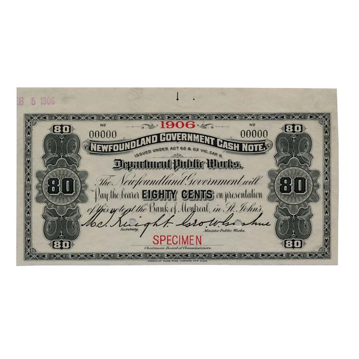 Newfoundland Government Cash Note. 80 Cents. 1906. NF-4fS. Specimen. PMG Superb Gem Unc-67 EPQ.