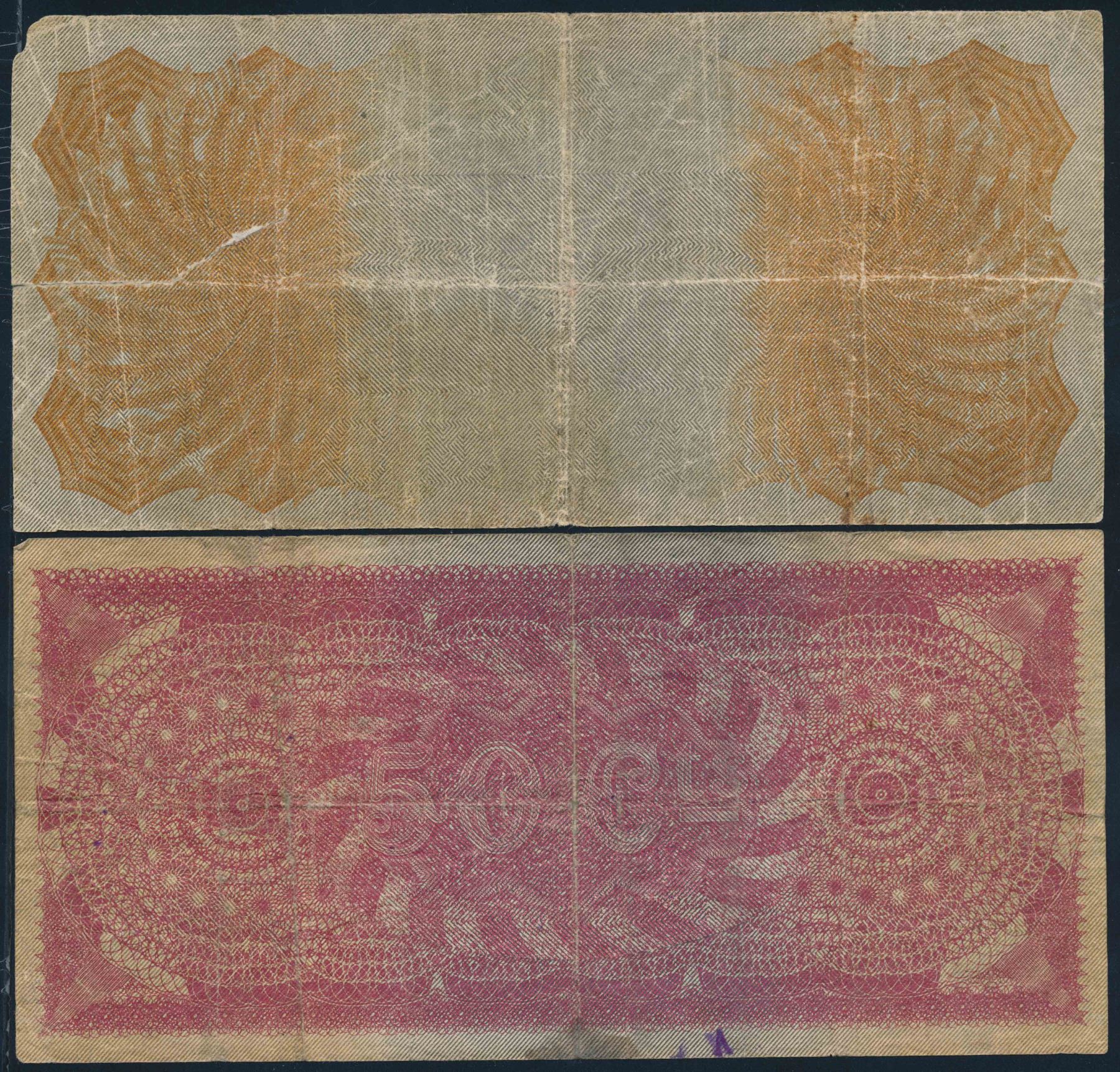 The 25c has a major tear of c. 5 cm. The 50c. Is a nice in.