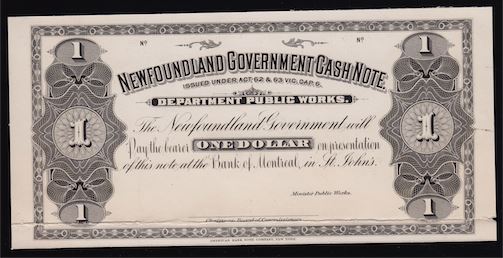 Newfoundland Government Cash Note One Dollar Proof CH NF-5P. A Black and White Face Proof, on thick card. EF, damage at right, horizontal fold at bottom. 1905 stamped on back.