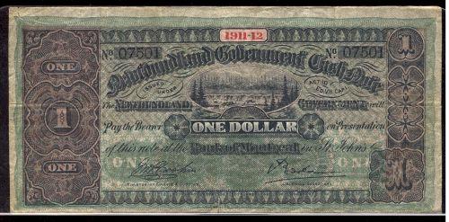 Newfoundland Government Cash note, NF-9b 1911-12 ONE DOLLAR 07501 F-VF. Scarce!