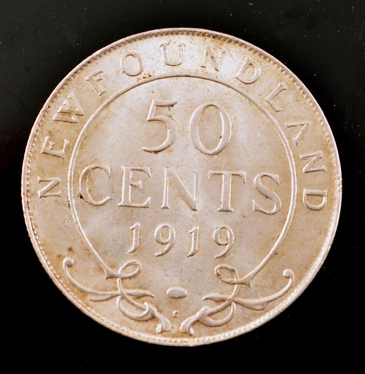 Newfoundland, Fifty Cents, 1919C, AU-55, with lustre. Needs a bath.