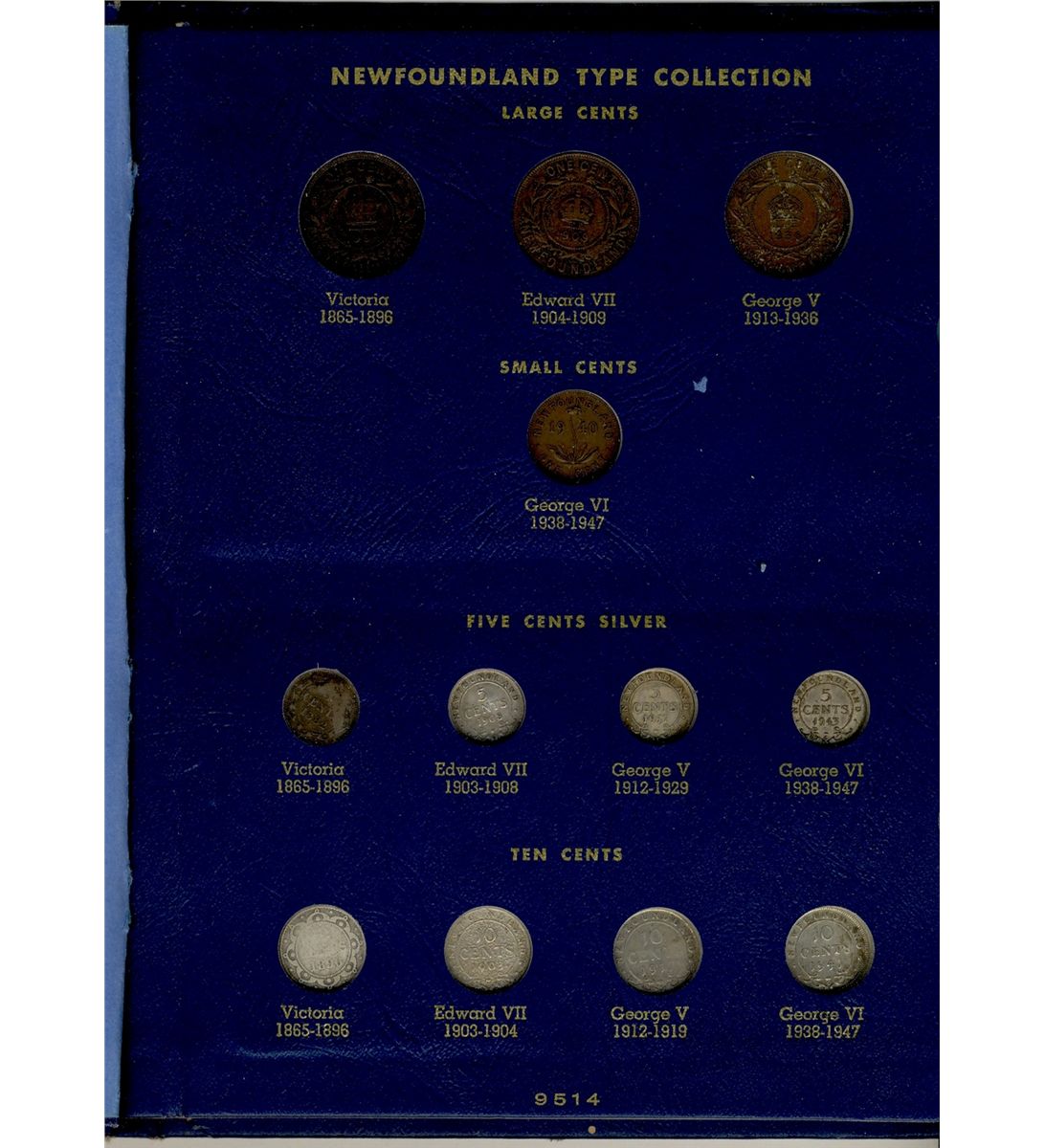 Newfoundland Type Collection (Whitman holder); Includes Nfld 1¢ 1894, 1909, 1936, 1940, 5¢ 1882H, 1908, 1917c, 1943c, 10¢ 1896, 1903, 1917c, 1941c, 20¢ 1882, 1912, 25¢ 1917c & 50@ 1900, 1919c. Good to VF.