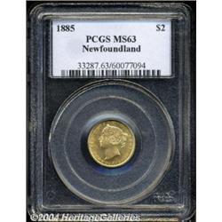 Newfoundland. Victoria Gold $2 1885, KM5, MS63 PCGS. Only two pieces have been certified finer by PCGS. Important notice: Heritage usually auctions material at the rate of 200-250 lots per hour. On some occasions eBay Live bid software or the Internet may not be able to keep up with the pace of the auction. We recommend placing a realistic absentee bid now as insurance to avoid disappointment. Occasionally the auctioneer may eliminate or reject an eBay Live bid, and the auctioneer may also reopen a lot after the close of the eBay live bidding (usually because we missed an audience bid), and may reject your bid even if it shows you as the winning bidder. By bidding via eBay Live, you agree that Heritage may award the lot to another bidder at its sole discretion under the circumstances described above or any other reasonable circumstances. Also please note that all Heritage lots purchased through eBay Live carry a 20% Buyer's Premium. Please make sure you read the Terms and Conditions before you bid.