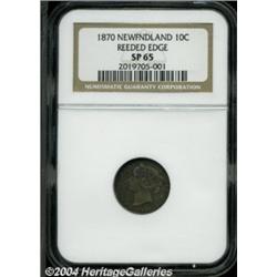 Newfoundland. Victoria SPECIMEN 10 cent 1870, Reeded Edge, KM3, SPECIMEN 65 NGC. Wonderful toning with nicely mirrored fields. A bit more deeply toned than the Belzberg example. A total of only three pieces have been certified SPECIMEN by NGC and PCGS combined, and this is the finest numerically certified coin and the only piece certified SPECIMEN 65. One of the great rarities of Newfoundland numismatics. Important notice: Heritage usually auctions material at the rate of 200-250 lots per hour. On some occasions eBay Live bid software or the Internet may not be able to keep up with the pace of the auction. We recommend placing a realistic absentee bid now as insurance to avoid disappointment. Occasionally the auctioneer may eliminate or reject an eBay Live bid, and the auctioneer may also reopen a lot after the close of the eBay live bidding (usually because we missed an audience bid), and may reject your bid even if it shows you as the winning bidder. By bidding via eBay Live, you agree that Heritage may award the lot to another bidder at its sole discretion under the circumstances described above or any other reasonable circumstances. Also please note that all Heritage lots purchased through eBay Live carry a 20% Buyer's Premium. Please make sure you read the Terms and Conditions before you bid.