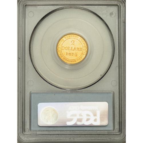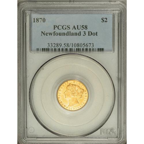 <B>Newfoundland. Victoria gold 2 Dollars 1870 Three Dots, </B></I>KM5, AU58 PCGS, a highly lustrous coin with some typical small surface marks.<BR><BR><b>Shipping:</b> Coin/Currency (<a target="_blank" href="http://www.heritageauctions.com/common/shipping.php">view shipping information</a>)