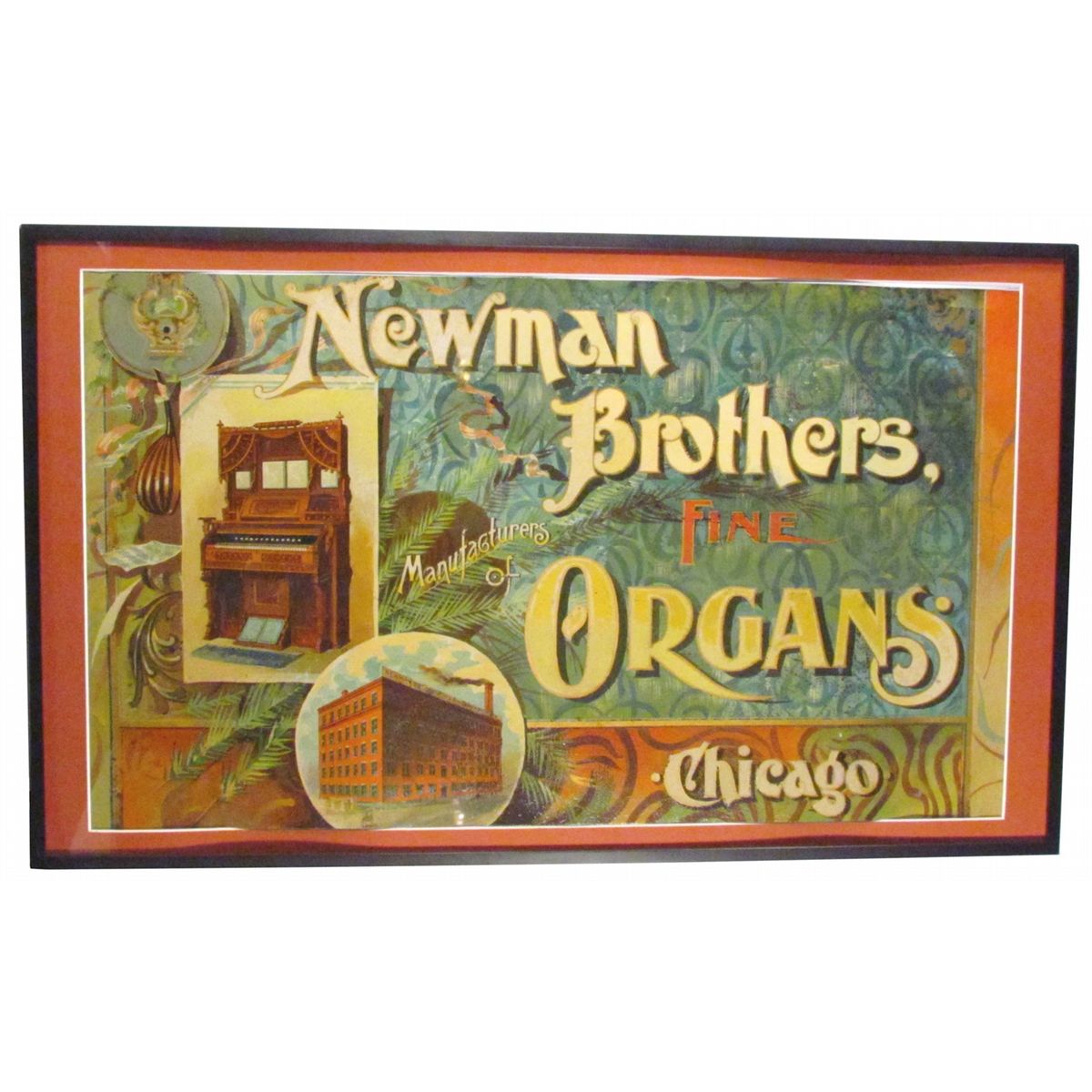 Newman Brothers, Fine Organs Tin Sign. Sign has been trimmed with minor professional restoration. Framed under glass. 30 X 18 inches overall.