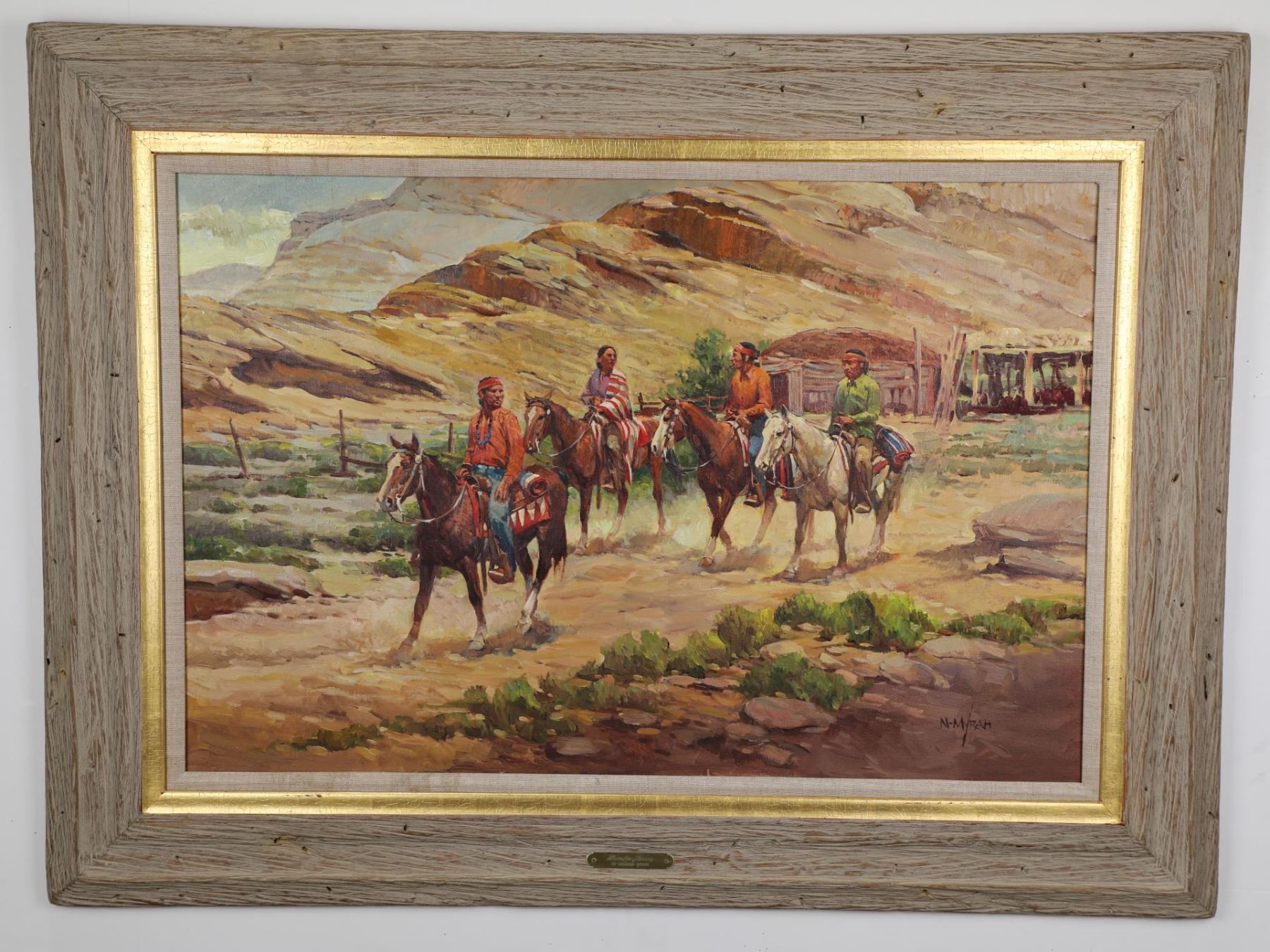 35" by 46 1/2" framed. 24" x 36" unframed. Title is Navajo Trace. Newman Myrah (1921 - 2010) was active/lived in Oregon, Saskatchewan. Newman Myrah is known for Horses, western genre, illustrator. Known for his western scene paintings, especially with horses and cowboys, Newman Myrah has his studio in Oregon and was born in Saskatchewan, Canada. He said: "...my interest in the horse and what the animal meant to the West determines the subject matter of many of my paintings." When he was five years old, Myrah moved to Deer Lodge, Montana with his parents and was raised in a small town, where he was the only kid that seemed to have art talent. After high school, he went to commercial art school in Portland During World War II, he was in Japan and in 1949, became a free-lance artist in Portland. By 1980, he was a full-time fine-art painter and credits Charles Russell for much of his inspiration. Myrah was a charter member of the Northwest Rendezvous Group.