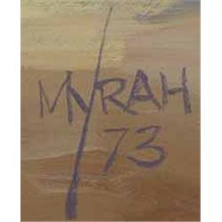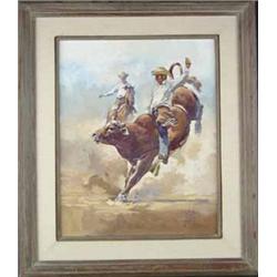 Newman Myrah (b.1921) (Oregon) Oil on Canvas. Bull Rider. 1973. 16" x 20". signed lower right. Est $2,500 - $3,500.