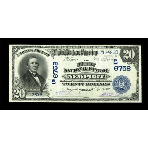 <B>Newport, AR</B></I> - $20 1902 Plain Back Fr. 650 <B>The First NB</B></I> Ch. # (S)6758<BR> This piece is recorded in the census as CU and it is little wonder why. The piece boasts perfect eye appeal for an <B>Extremely Fine, </B></I>including bold embossing and bright white paper.<BR><BR><b>Shipping:</b> Coins & Currency (<a target="_blank" href="http://www.heritageauctions.com/common/shipping.php">view shipping information</a>)