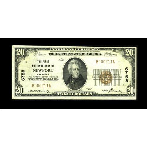 <B>Newport, AR</B></I> - $20 1929 Ty. 1 <B>The First NB</B></I> Ch. # 6758<BR>This is somewhat of a hoard note in large size, where high grade pieces abound, but small examples from here are quite scarce, with this easily the nicest listed in the census. Bright <B>Extremely Fine.</B></I><BR><BR><b>Shipping:</b> Coin/Currency (<a target="_blank" href="http://www.heritageauctions.com/common/shipping.php">view shipping information</a>)