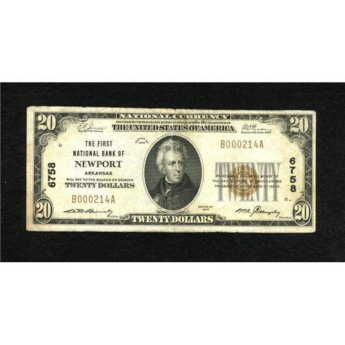 <B>Newport, AR</B></I> - $20 1929 Ty. 1 <B>The First NB</B></I> Ch. # 6758<BR>Certainly not a common piece, but this <B>Fine</B></I> should find a welcome home. A small paper skin is noticed at left with light staining.<BR><BR><b>Shipping:</b> Coins & Currency (<a target="_blank" href="http://www.heritageauctions.com/common/shipping.php">view shipping information</a>)