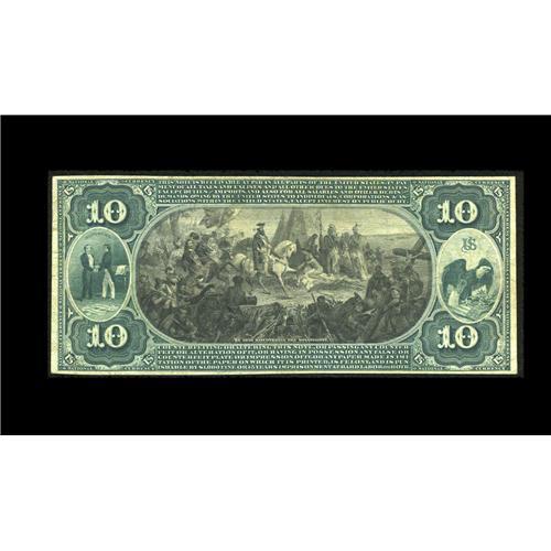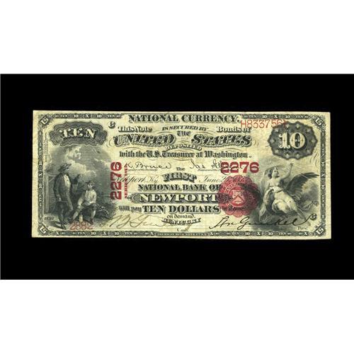 <B>Newport, KY</B></I> - $10 1875 Fr. 420 <B>The First NB</B></I> Ch. # 2276<BR>This is a truly wonderful item from a bank which was chartered at the tail end of the First Charter period in 1875 and proceeded to liquidate in 1897. This piece is the only known survivor from that unsuccessful venture, and traces its pedigree back to a 1951 Abe Kosoff sale. It then entered the collection of Glenn Martin, and only became available upon the dispersal of that collection in 2002. Once again, the Gale holdings give collectors the opportunity to obtain a unique item, and, once again, the condition is outstanding, with the note grading a bright <B>Very Fine</B></I> with vivid colors and no flaws whatever save for a few pinholes which affect nothing. This is another note which will look very inexpensive the day after the sale regardless of the amount it brings tonight.