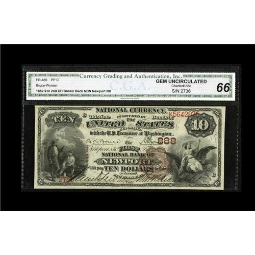 <B>Newport, NH</B></I> - $10 1882 Brown Back Fr. 480 <B>The First NB </B></I> Ch. # 888<BR>This gorgeous pen signed example grading CGA <B>Gem Uncirculated 66</B></I> is well margined.