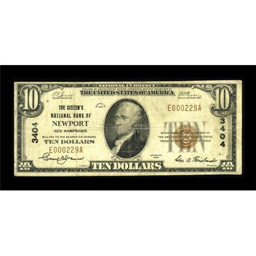 <B>Newport, NH</B></I> - $10 1929 Ty. 1 <B>The Citizens NB</B></I> Ch. # 3404<BR> Auction appearances of small size notes from here have been few and far between. This is a new addition to the scant population and should prove popular. <B>Fine</B></I> with a couple of pinholes noticed.<B></B></I><BR><I>From The Kansas City Collection.</B></I><BR><BR><b>Shipping:</b> Coins & Currency (<a target="_blank" href="http://www.heritageauctions.com/common/shipping.php">view shipping information</a>)