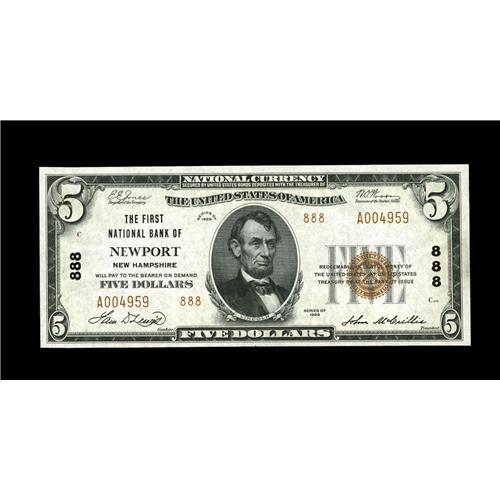 <B>Newport, NH</B></I> - $5 1929 Ty. 2 <B>The First NB </B></I> Ch. # 888<BR>Two light bends keep this <B>About Uncirculated</B></I> example from a higher grade. We sold a Fine Type 1 $20 from here with some aesthetic problems for $195.50 at our September 2005 Long Beach auction. This exceptionally attractive $5 Type 2 will easily surpass that and then some.