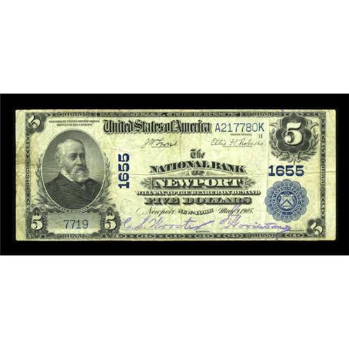 <B>Newport, NY</B></I> - $5 1902 Plain Back Fr. 598 <B>The NB of Newport</B></I> Ch. # 1655<BR> Although chartered in 1865, this institution, nestled in an obscure Herkimer County location, produced just the small number of notes needed to ensure its role as the sole issuer here. The latest census shows just four large examples extant from the bank, with only one such piece offered since 1985, with that note grading About Good. This newly discovered specimen is offered for the first time, and should see considerable bidding from those collectors who have long hoped for a decent large example to surface from here. Pleasing <B>Fine-Very Fine,</B></I> with bright purple signatures. <BR><BR><b>Shipping:</b> Coins & Currency (<a target="_blank" href="http://www.heritageauctions.com/common/shipping.php">view shipping information</a>)