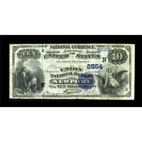 <B>Newport, RI</B></I> - $10 1882 Date Back Fr. 545 <B>The Union NB</B></I> Ch. # (N)2554<BR> This is a very scarce type from a just plain tough to find bank which issued large notes only before liquidating in 1912. This was one of only two banks in Rhode Island to issue 1882 Date Backs, and the only one outside of Providence. <B>Fine-Very Fine,</B></I> with a bit of soiling on the reverse.<BR><BR><b>Shipping:</b> Coins & Currency (<a target="_blank" href="http://www.heritageauctions.com/common/shipping.php">view shipping information</a>)