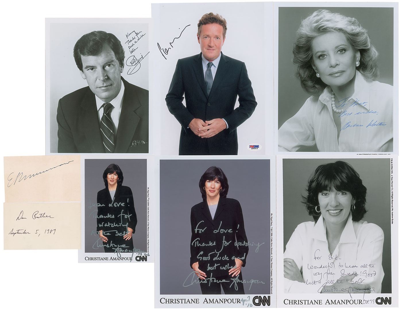 Eight items signed by newscasters and TV journalists, some inscribed, including: Edward R. Murrow (signature), Dan Rather (signature), Peter Jennings (SP), Piers Morgan (SP), Barbara Walters (SP), and Christiane Amanpoour (three SPs). In fine condition, with a PSA/DNA label affixed to the Piers Morgan photo. Accompanied by a certificate of authenticity from PSA/DNA for Morgan.