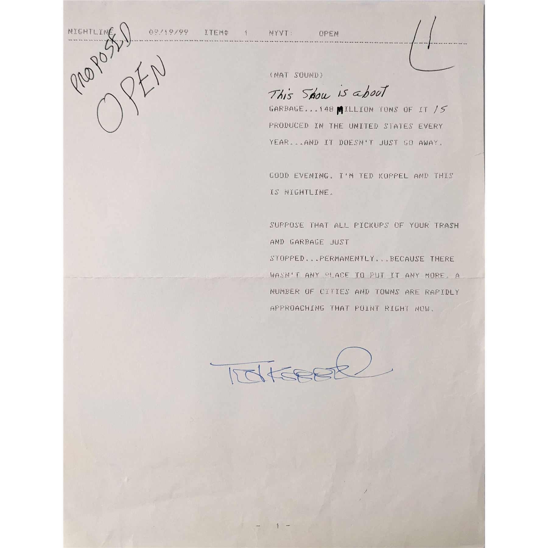 Newscaster Ted Koppel signed script. 9 x 11 inches.