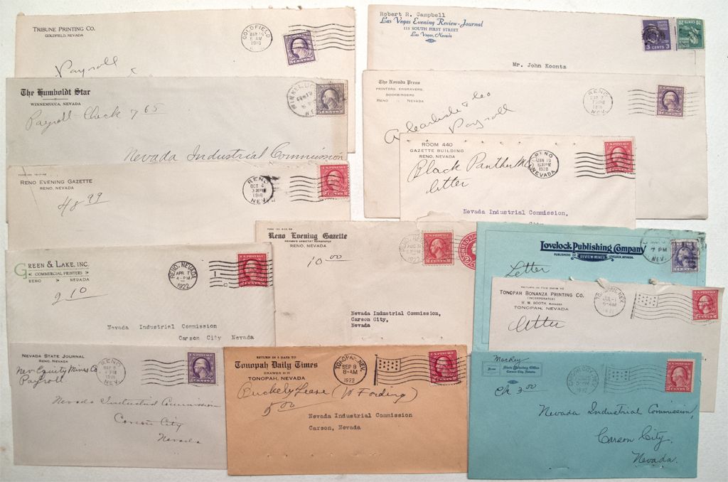 Thirteen pieces. State Printing Office, Tribune of Goldfield, Las Vegas Evening Review Journal (1947), Lovelock Publishing, Nevada Press of Reno, Reno Evening Gazette, Nevada State Journal, Green & Lake commercial printers, Tonopah Daily Times, Tonopah Bonanza Printing, The Humboldt Star of Winnemucca. Some repeats with different corner advertising.