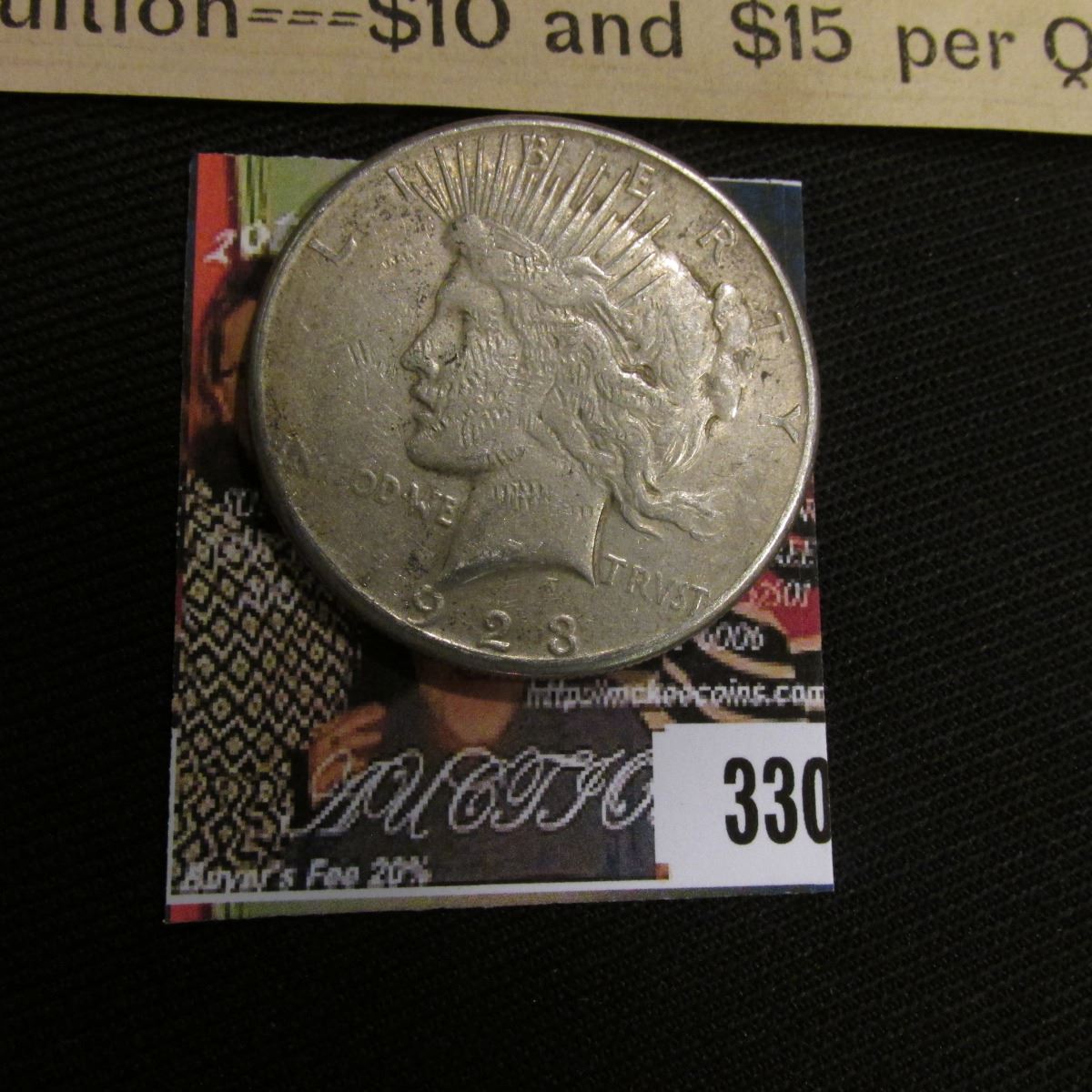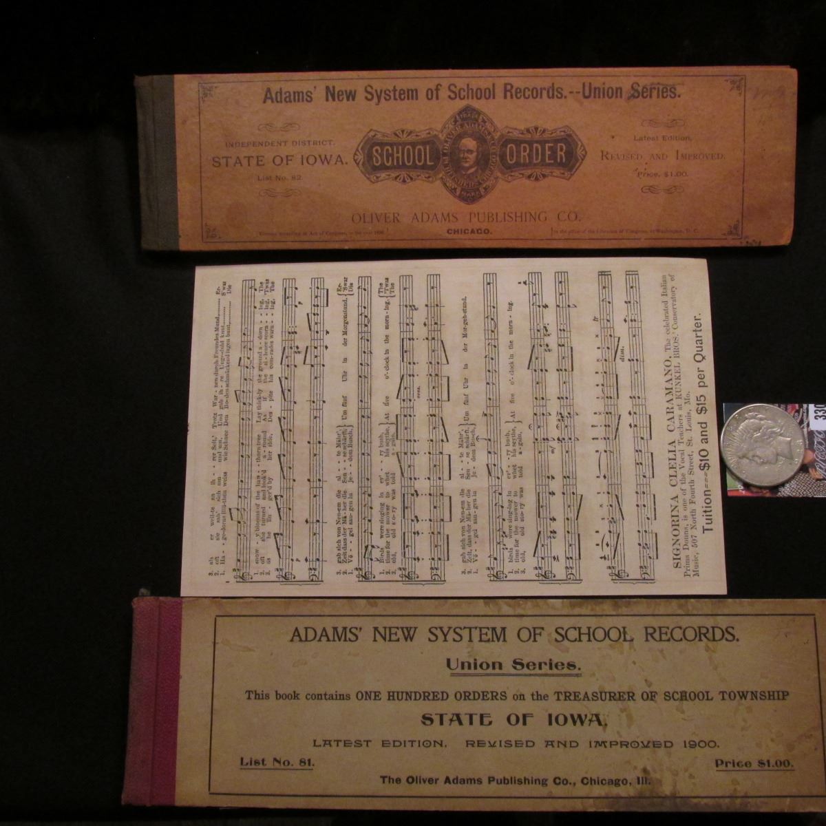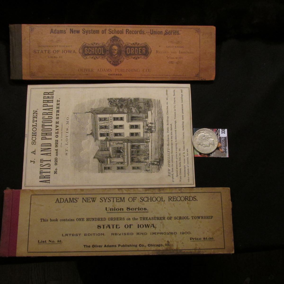 Newspaper advertisement "J.A. Scholten, Artist and Photographer…St. Louis, Mo.; unused "Adams' New System of School Records. Union Series. This book contains One Hundred Orders on the Treasurer of School Township State of Iowa. Latest Edition. Revised and Improved 1900 List No. 81. Price $1.00. The Oliver Adams Publishing Co., Chicago, Ill.; & No. 82 Union Series Entered according to Act of Congress in the Year 1890; & 1923 S U.S. Silver Peace Dollar, Fine.
