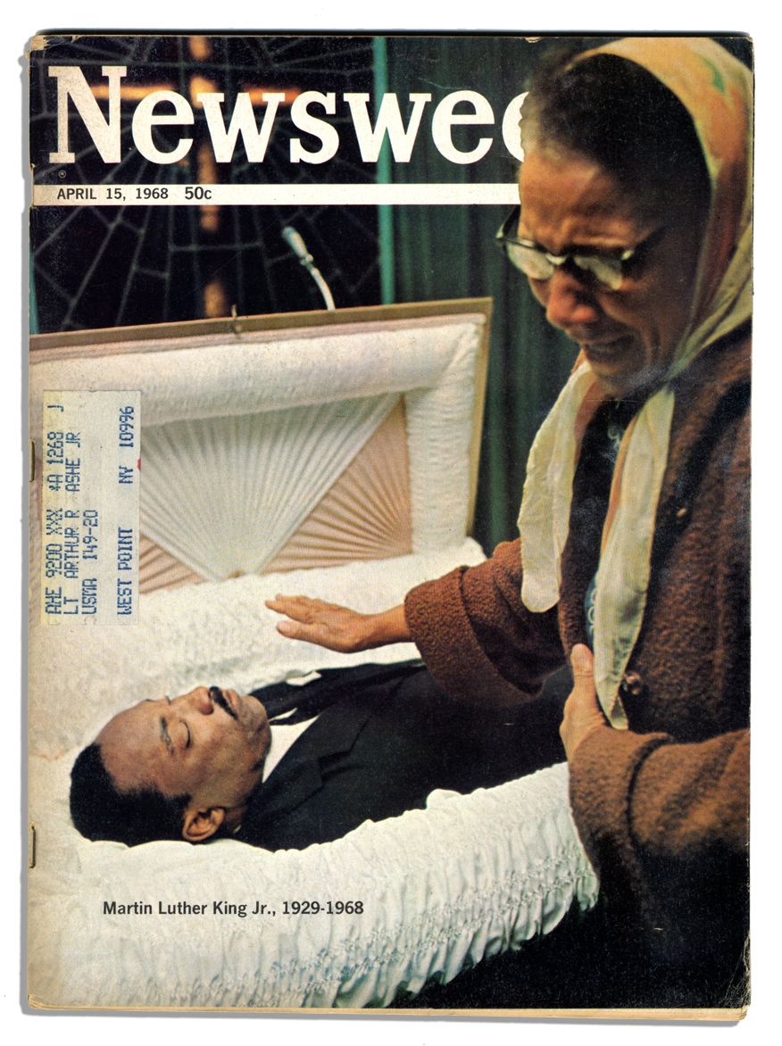 Arthur Ashe's personally owned copy of the 15 April 1968 issue of ''Newsweek'' covering Martin Luther King's death. Magazine cover has a mailing label affixed, addressed in print to ''Lt. Arthur R. Ashe Jr.'' Ashe was a lieutenant in the U.S. Army at the time. Measures 8.5'' x 11''. Toning and some creasing to corners, else near fine. With an LOA from Arthur Ashe's widow.