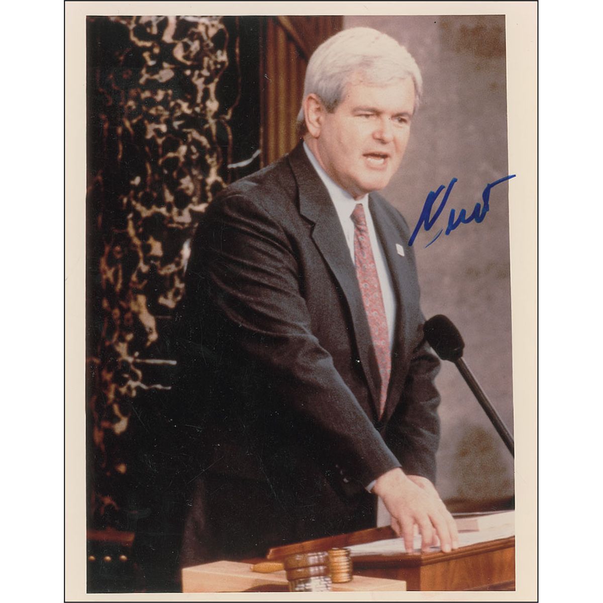 Color glossy 8 x 10 photo of Gingrich at the podium in Congress, signed in-person in blue felt tip, first name only. In fine condition, with a few minor surface creases. Originally obtained by in-person specialist Mike Wehrmann.
