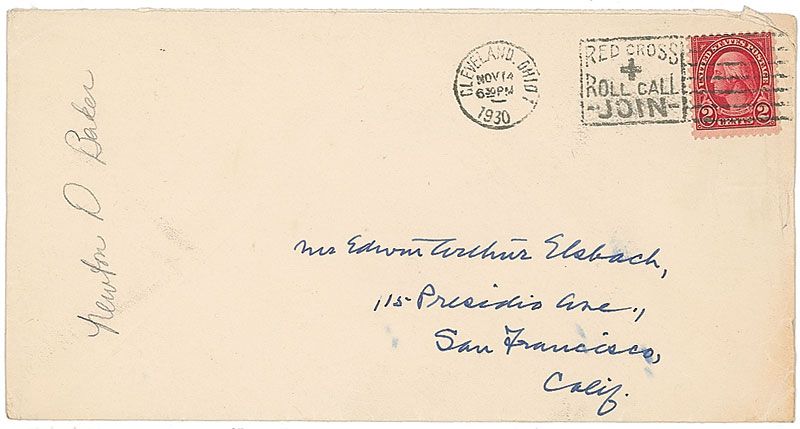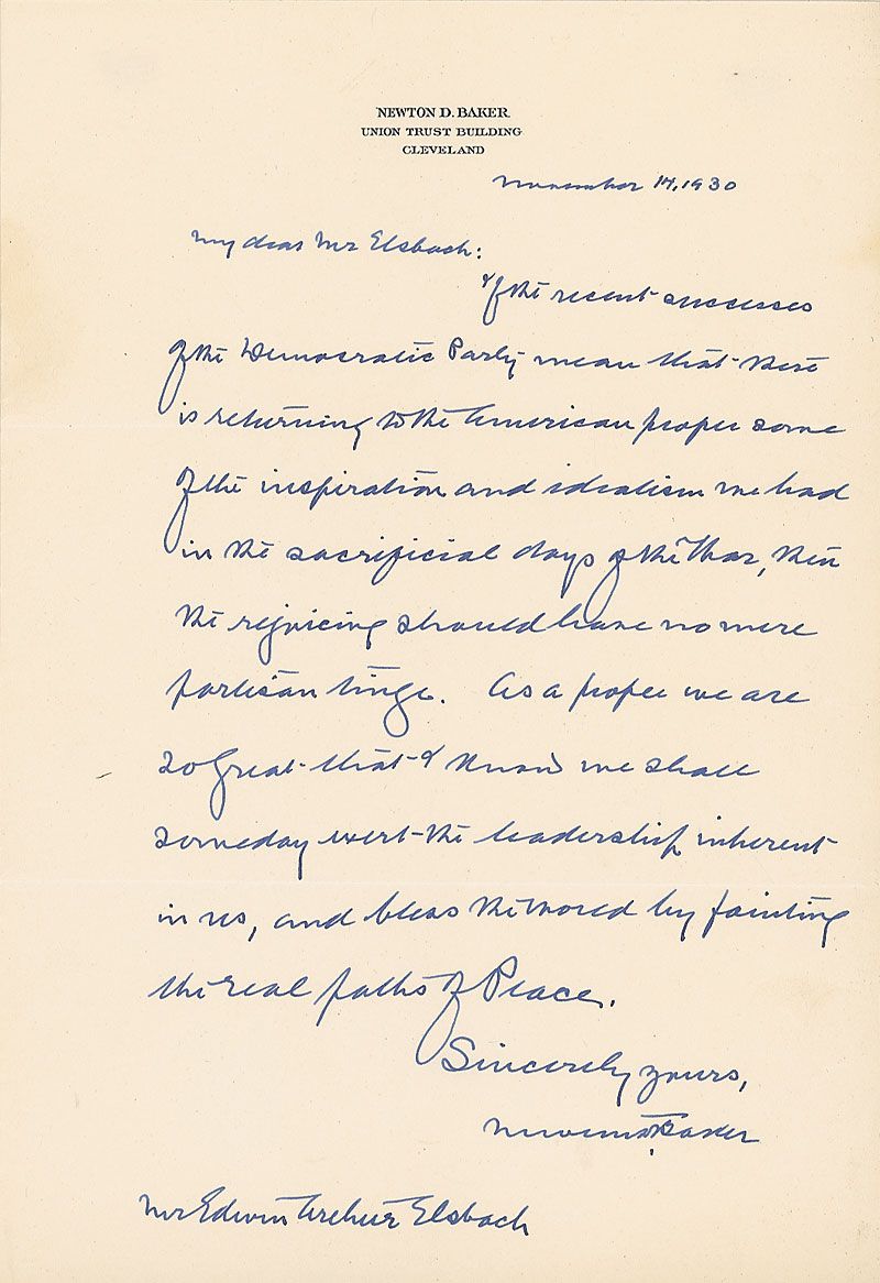 Politician who served as secretary of war under Woodrow Wilson (1871–1937). ALS, one page, 7 x 10.25, personal letterhead, November 14, 1930. Letter to Edwin Arthur Elsbach. In full: “If the recent successes of the Democratic Party mean that there is a returning to the American people some of the inspiration and idealism we had in the sacrificial days of the War, then the rejoicing should have no mere partisan tinge. As a people we are so great that I know we shall someday exert the leadership inherent in us, and bless the world by pointing the real paths of Peace.” In fine condition, with mild scattered toning. Accompanied by the original mailing envelope, filled out in Baker’s hand.