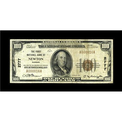 <B>Newton, KS</B></I> - $100 1929 Ty. 1 <B>The First NB</B></I> Ch. # 2777<BR>This bank's issue consisted primarily of $50 and $100 notes through the years of its existence, including just 33 sheets of the $100 Ty. 1. Tonight's example is an appealing <B>Very Fine</B></I> and is scarce and well preserved enough to sell in the range of...<BR><BR><b>Shipping:</b> Coin/Currency (<a target="_blank" href="http://www.heritageauctions.com/common/shipping.php">view shipping information</a>)