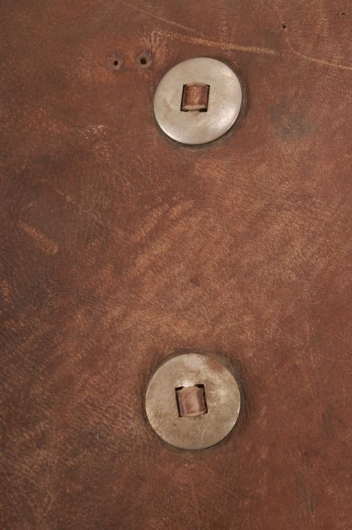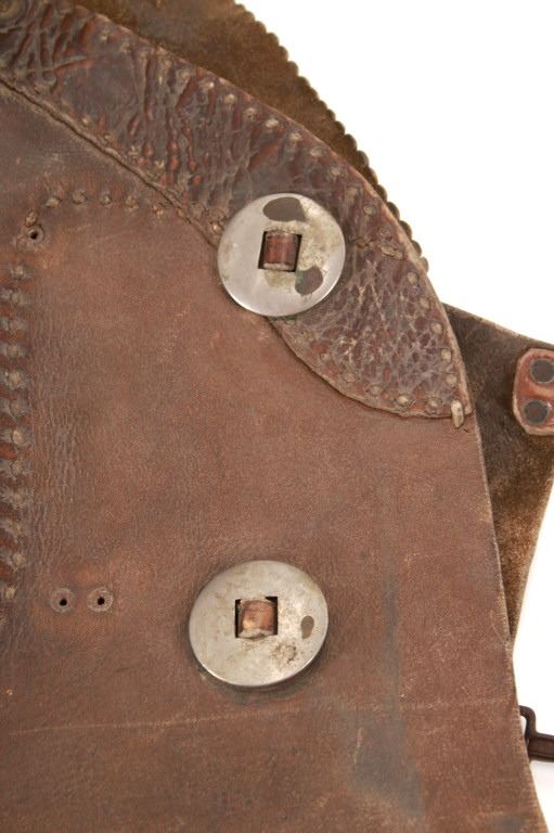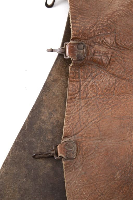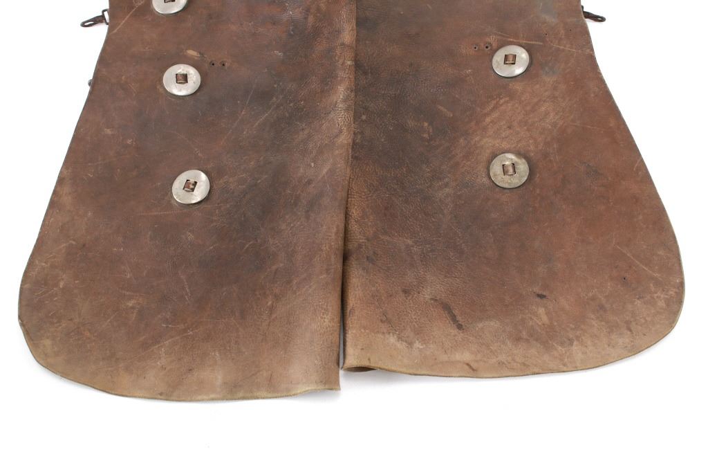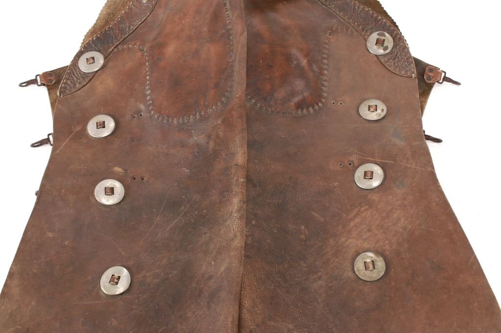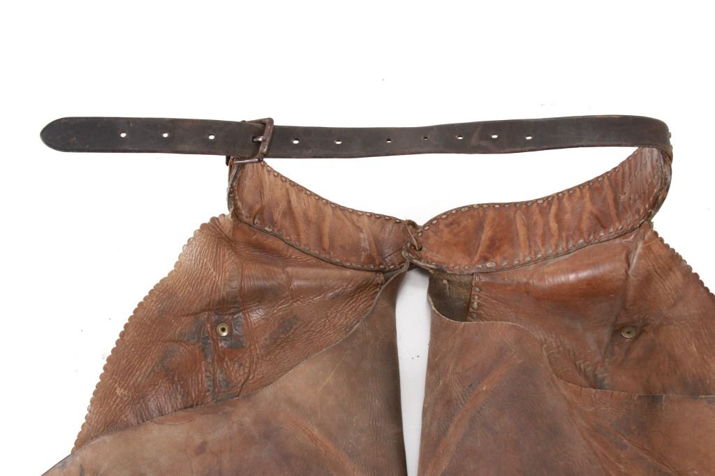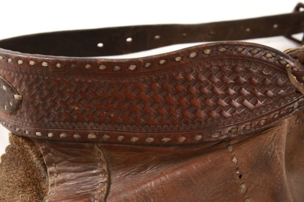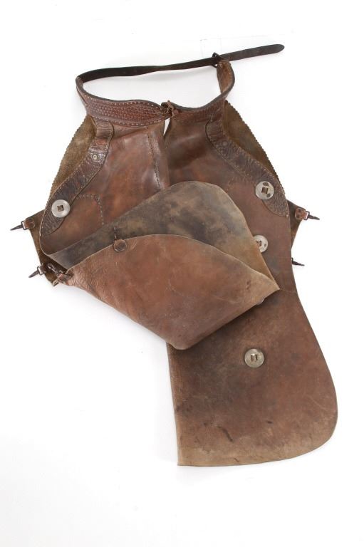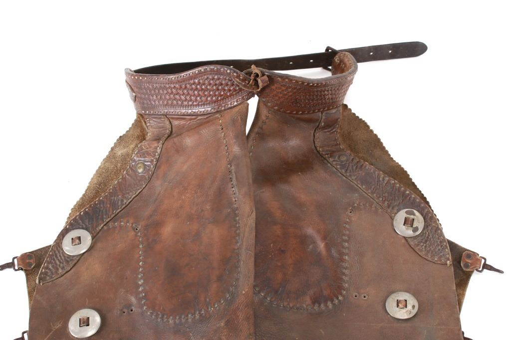 Featured in this lot is this Newton Porter Phoenix, Arizona batwing work chaps circa 1920 to 1940's. The chaps feature a wonderfully and professionally crafted leather and nickel construction that shows a tradition batwing design with basket woven tooled design to the waist band and is marked with makers mark buttons on the chaqps that read as follows: N. Porter - Phoenix, Ariz. Porter's chaps are very collectable. Newton started his business in Texas in 1875 and moved to Phoenix in 1895, where he established the N. Porter Saddle & Harness Company, which became one of the finest saddleries over the next 70 years. After Porter died in approximately 1906, his oldest son, Earl, took over the operation of the business, and he continued to institute the same business practices of his father until his death in 1925 when the business was taken over by Newton Porters youngest son, Fred Porter.The N. Porter Saddle & Harness Company remained family owned and operated until the closing of the business in the mid 1960s. N.Porter Saddles & Harness Company employed two dozen or more master craftsmen, who tooled and sewed the saddles. Their saddles were world famous for being among the finest made. Whether you call them chaps, leggings, bat wings, woolies, or chinks, the different styles of leather leg coverings are an important part of a cowboy’s gear. Derived from the Spanish chaparreras, they protect a rider’s legs from brush, thorns and the elements. Different leathers cut in various styles have been used but the basic purpose remains the same. Winged chaps, sometimes referred to as “apron chaps” or “batwings” began to appear in the 1800s. A product of the South Texas brush country, they provided protection to the lower leg and the wing was an extension of the fringed side flap on shotguns. The first wings were cut straight and were not excessively wide. Later versions tapered out from the legs and flapped when the wearer walked. Old time cowboys are typically pictured in batwing chaps. The condition of this pair of Newton Porter batwing chaps is well preserved with some wear to the leather from age and use but otherwise shows a well preserved condition. The measurements of this pair of chaps is good 37 1/2" x 1/ 1/2". The collective weight of this pair of chaps is 5lb 12oz. Provenance: Owned by Norton family, Opportunity, Montana.