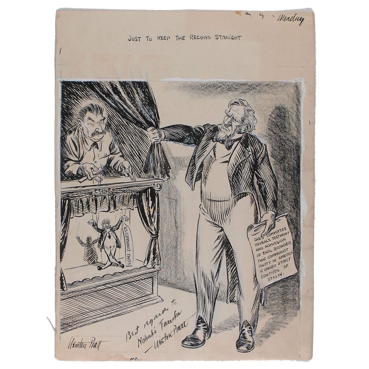Editorial cartoonist for the Sacramento Bee from 1938 to 1971 and three-time Pulitzer Prize finalist. Original hand-inked cartoon on an off-white 11 x 15 sheet of artist’s cardstock, titled “Just to Keep the Record Straight,” showing an Uncle Sam–type character pulling back a curtain to reveal Joseph Stalin as the puppet master of the American Communist Party, originally signed in the lower left in black ink, “Newton Pratt,” and later signed and inscribed, “Best regards to Nohuke Tauska—Newton Pratt.” Original Sacramento Bee newspaper tag is affixed to reverse, dated September 16, 1939. In fine condition, with general wear and soiling from production use.