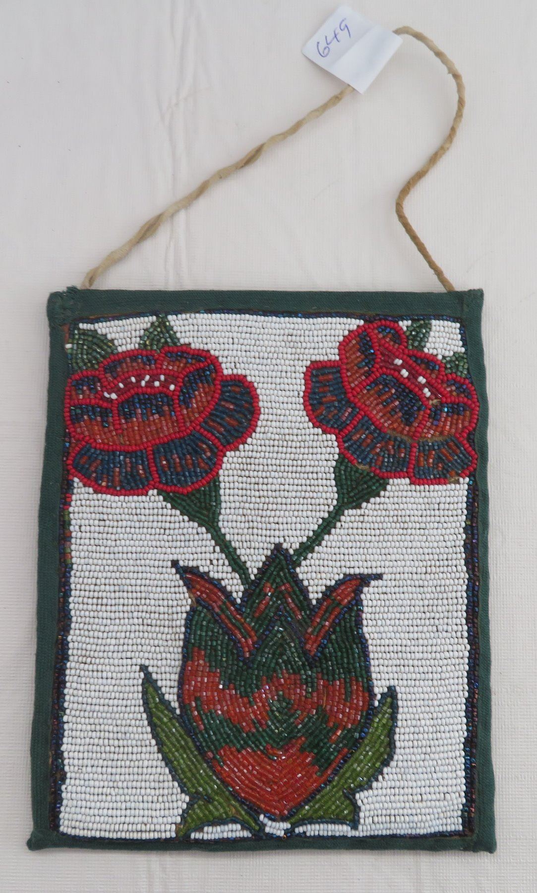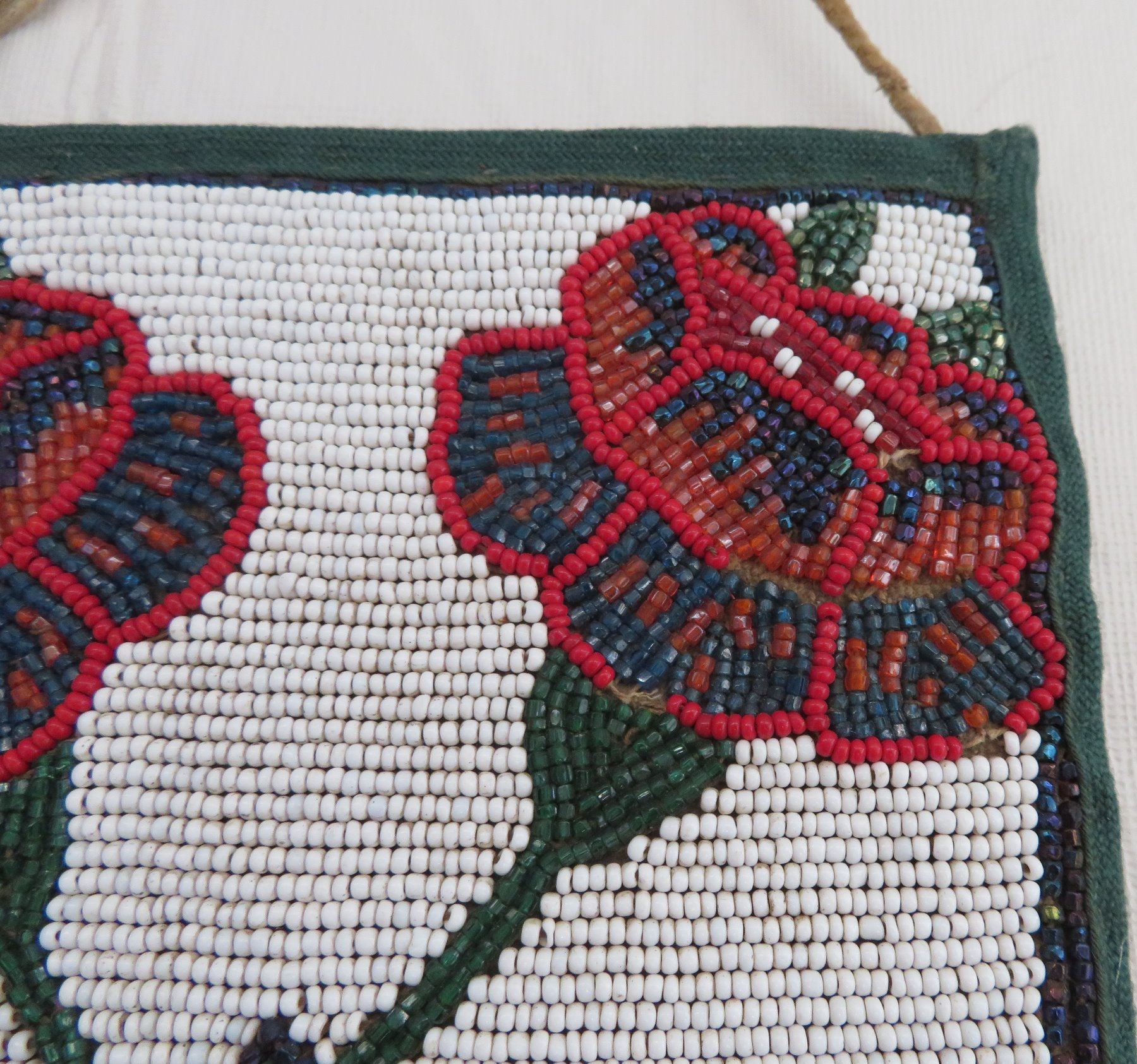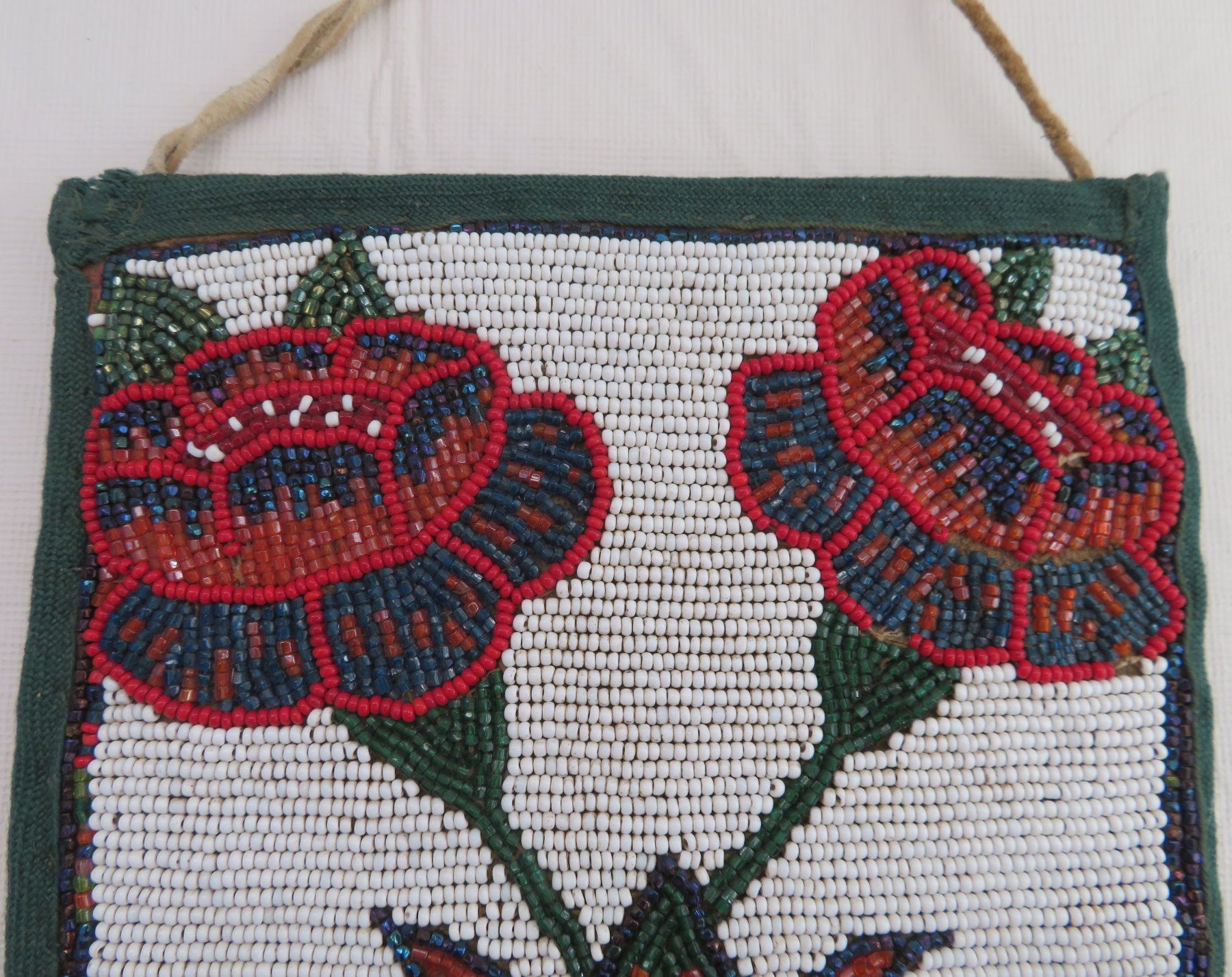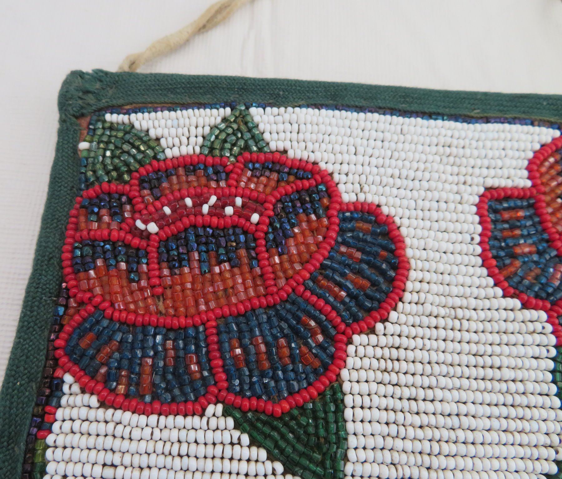 Nez Perce Beaded Bag, c. 1940s. Made of glass beads and cloth, the bag measures 7 1/2" x 6". Idaho. Condition: Good, see images. Shipping: $18.50 w/insurance and signature, due to value.