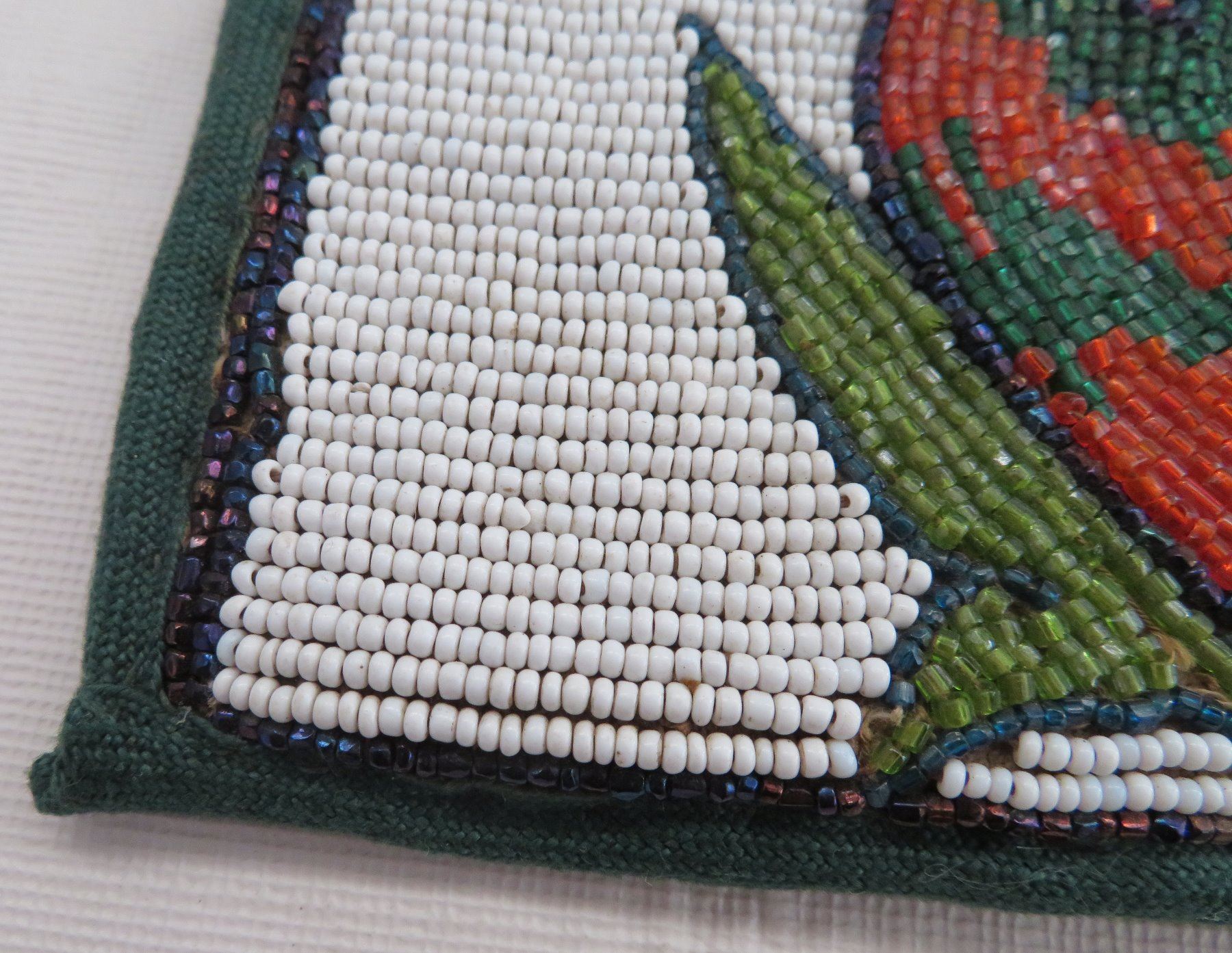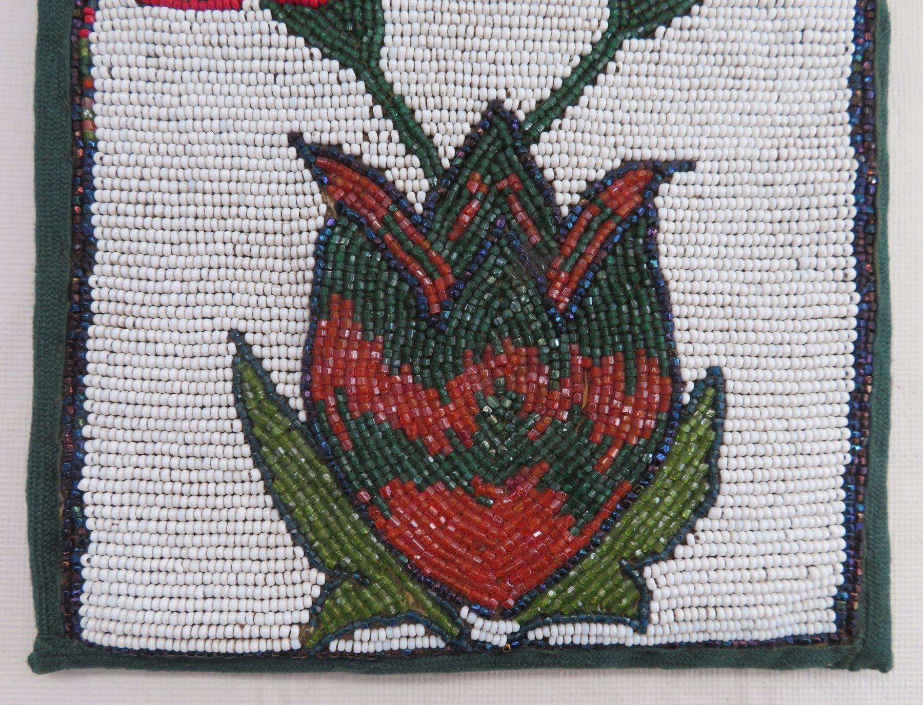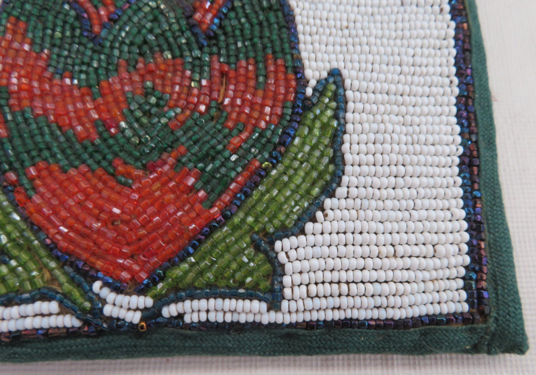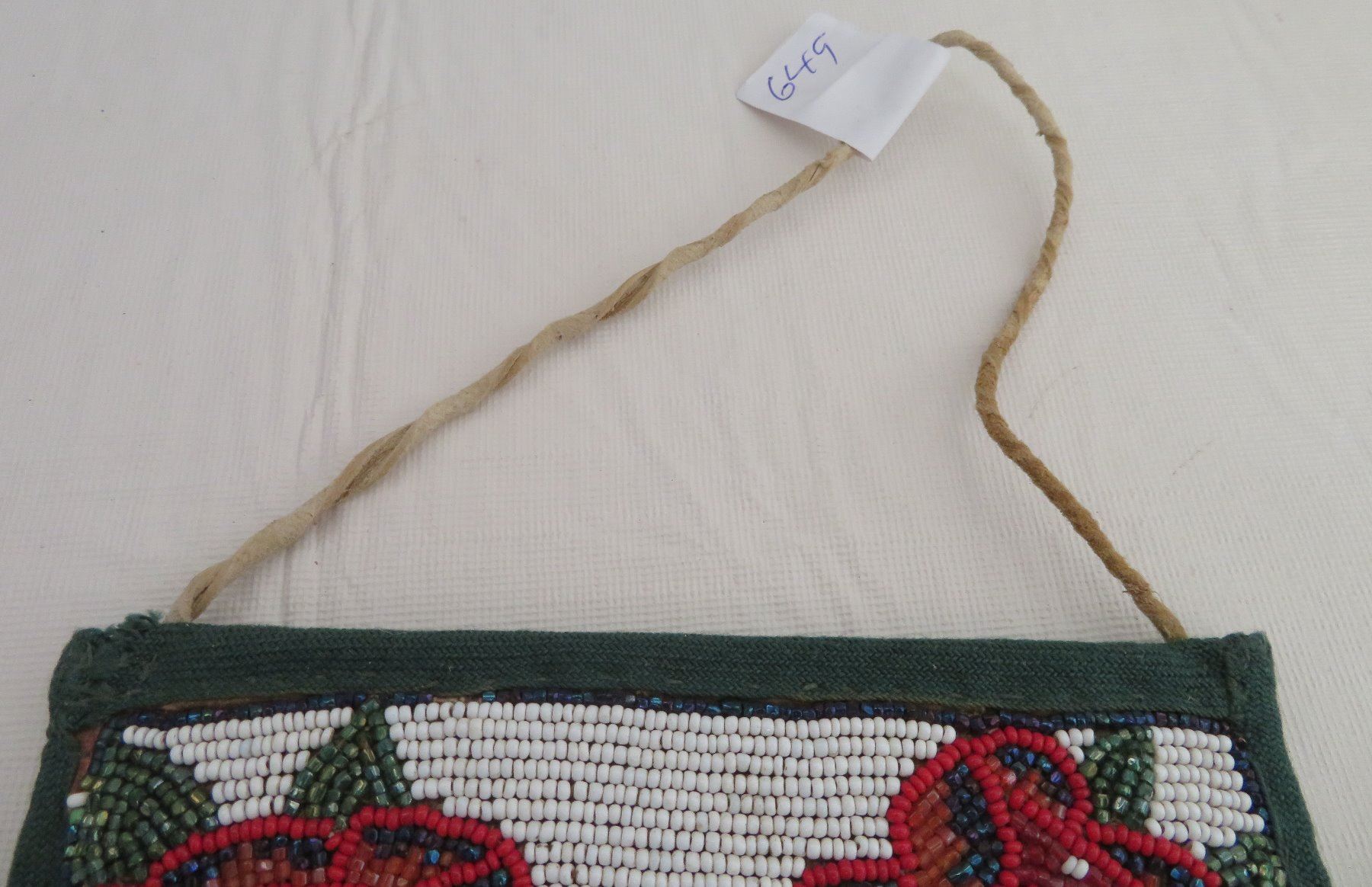 Nez Perce Beaded Bag, c. 1940s. Made of glass beads and cloth, the bag measures 7 1/2" x 6". Idaho. Condition: Good, see images. Shipping: $18.50 w/insurance and signature, due to value.