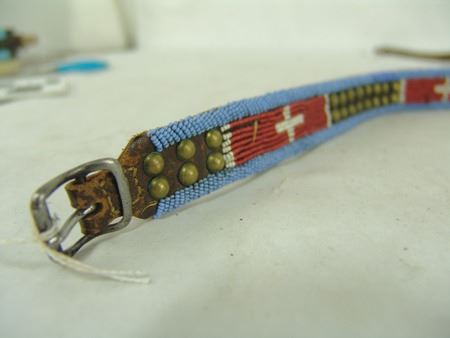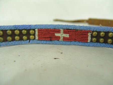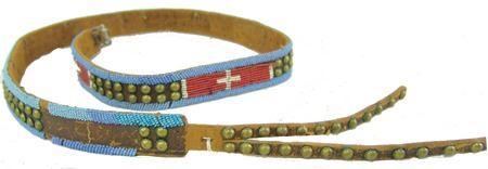 Ca. 1940s, A wonderful narrow harness leather belt with fully beaded design using tiny white heart and other seed beads, and with brass tacks with bifurcated tip. Good condition, a few missing beads. 43"