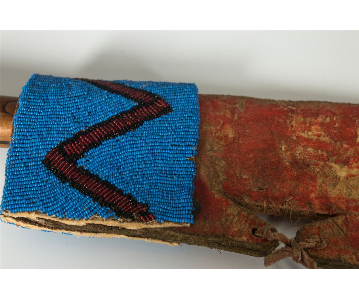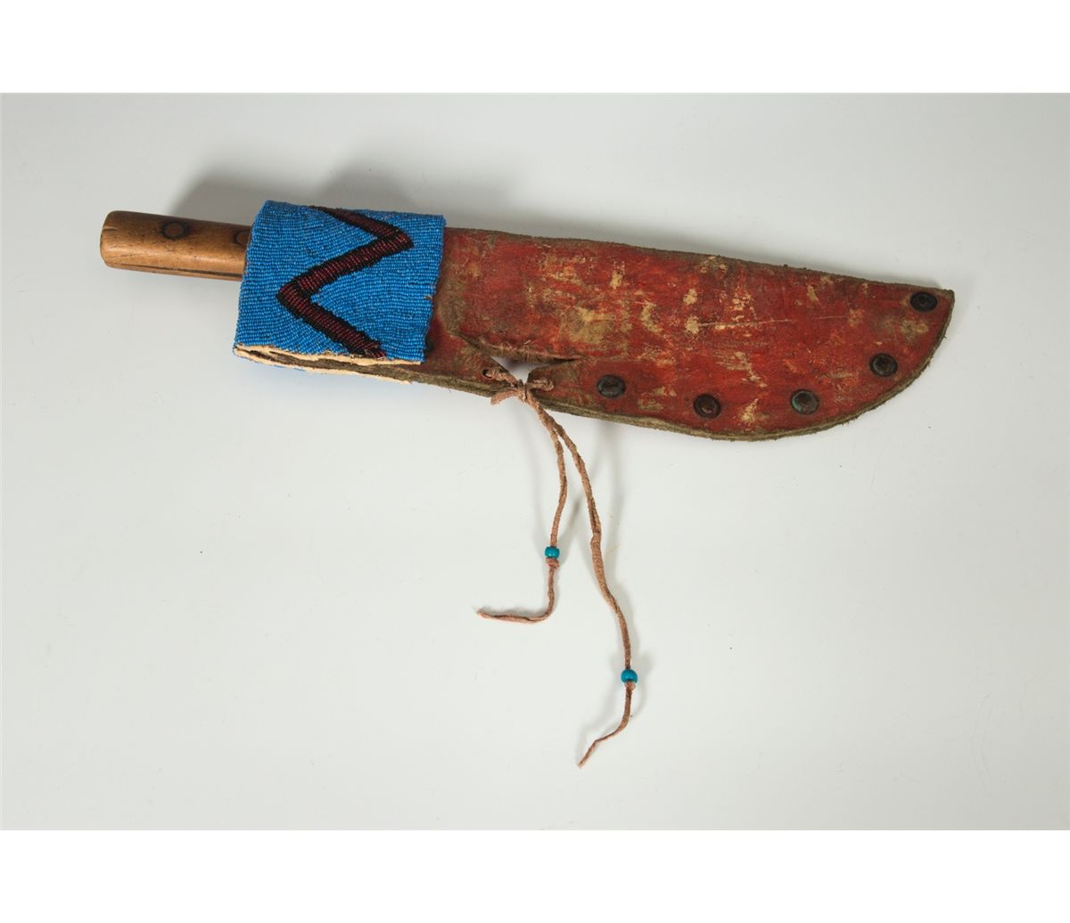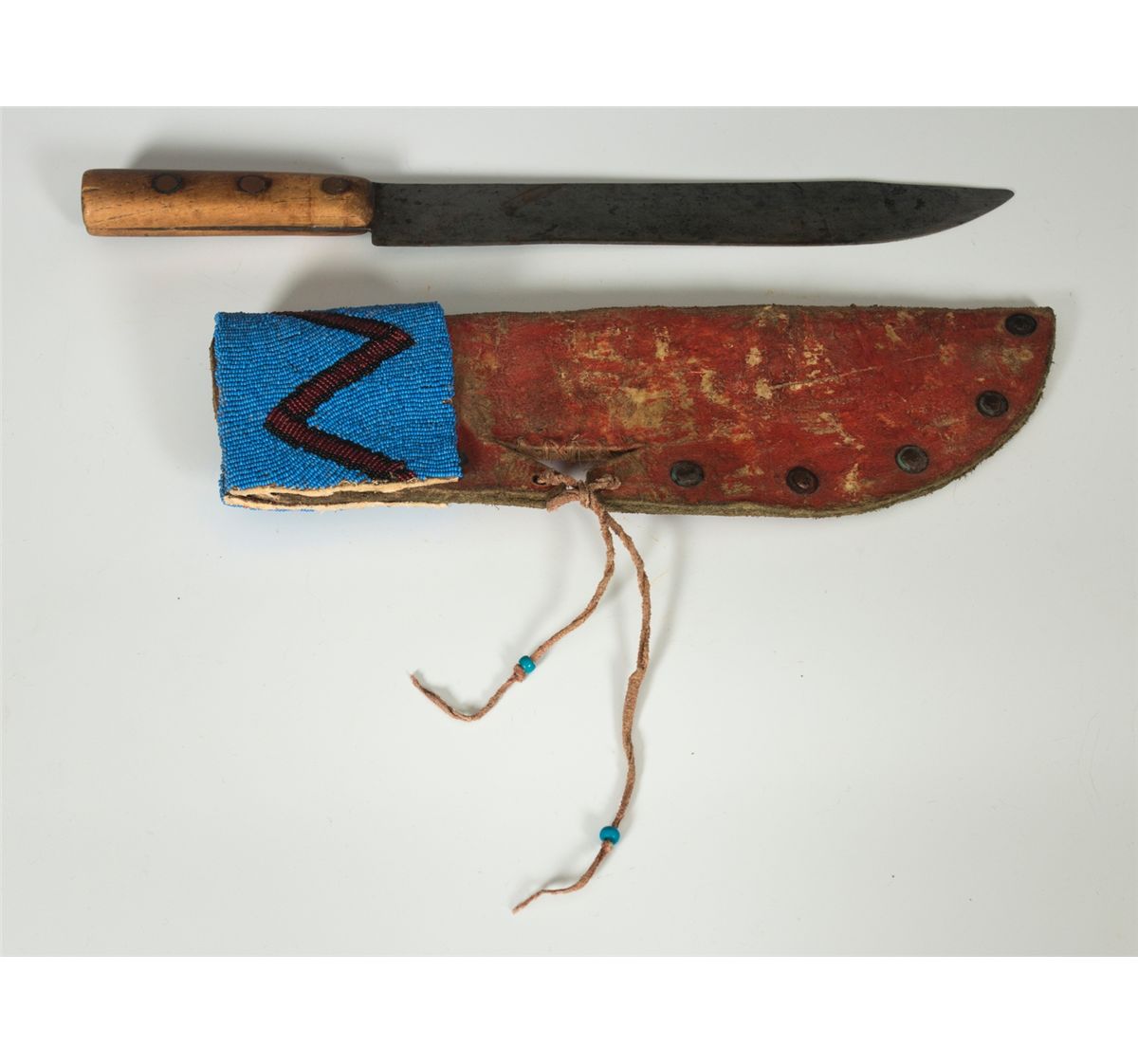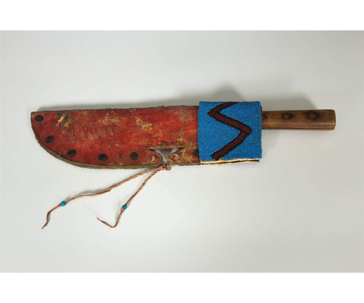Nez Perce Knife Sheath with Knife. 13" x 4" red-ochred parfleche with a belt cut-out. A 3.5" band of beadwork runs front to back. Tacks decorate the body of the sheath. Knife has a 10.5" unmarked blade. 4.75" handle is held together with copper. Circa 1880s. Provenance: Collected from Indian hands to a private Washington collection