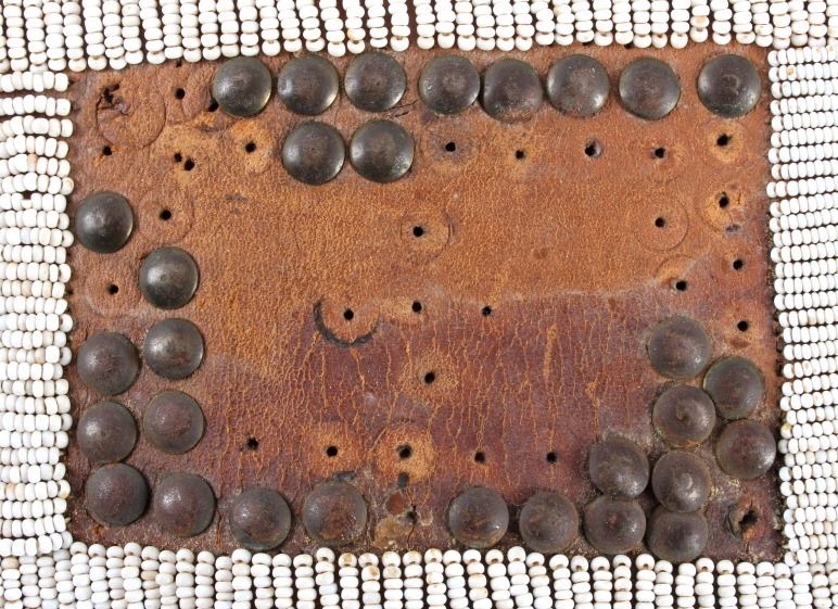 The lot features an authentic original beaded and tacked leather belt from the Nez Perce Native American Indians and dating to circa 1880-1890. The belt shows a saddle harness leather heavy construction with an excellent traditional geometric beaded design and artful brass covered iron trade tack accents. The beadwork shows all early glass trade seed beads with a chalk white border and framing and three geometric patterned sections showing padre sky blue, corn yellow, semi-transparent dark blue and medium/dark green. The belt shows an unusual and rare wide construction and is truly a very early and historic example. The belt also shows a cast iron square period buckle and overall good condition for its age. The belt has various missing tacks and a few strands of missing beads, but overall it is truly an excellent artful example. Provenance: From a large and historic Old Western Cowboy and Native American Indian private collection in Bozeman, Montana. The piece shows both trade thread and sinew sewn construction, a representation of its true authentic age. The belt is one of only a few large wide Nez Perce belts brought to public sale and is similar to the belt offered by High Noon and Manitou Galleries at their August in Santa Fe Art and Artifact Auction 8/12/2004 that sold for $2,232.50 (with premiums). Measures overall 38.5"L 3 3/8"W.