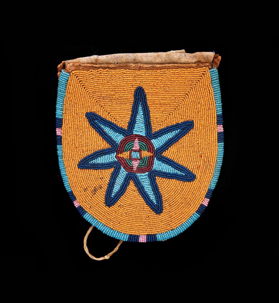 7 1/2” x 6 1/2” flap, beaded pouch with central red, yellow, green morning star inside large blue-on-blue star. Pumpkin colored background with signature beads on commercial tanned leather, c. 1880s.