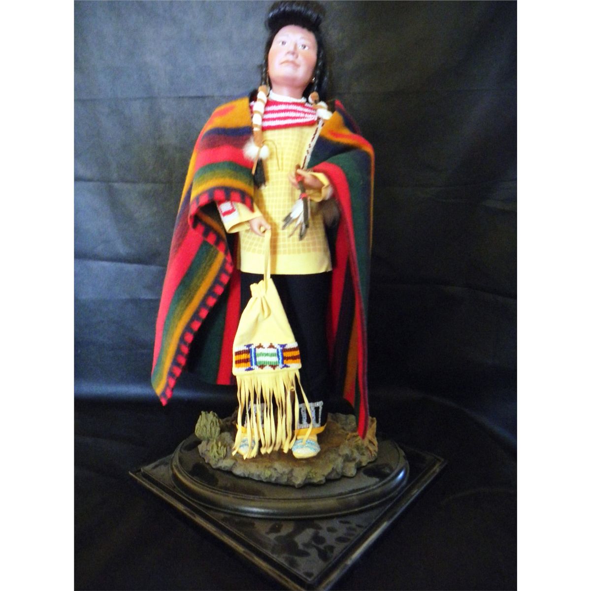 Native American Doll front Danbury Mint. The Artist is Judy Bell - Serial Number A3921. All Paperwork as well as invoices certificates of authenticity as well as original box. Case is included Invoices from original owner. Case included. Doll has Beaded bag, moccasins, legging and shell earrings and striped blanket. 21"x6"x4"- Shipping $50.00