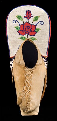 Nez Perce Child's Cradle. 30" x 12". Fully beaded top. Miniature moccasins hanging from front. c. 1930s. Fine condition. (est $2,000-3,000)