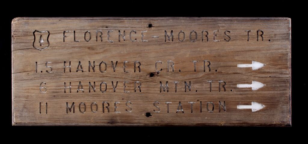This is an original Forest Service wood sign from Nez Perce-Clearwater National Forest. The sign reads, "Florence-Moores 1.5 Hanover Cr. Tr. 6 Hanover Mtn. Tr. 11 Moores Station." This is a wood sign and measures 9.25"x24" Rare. (solid no visible rot).