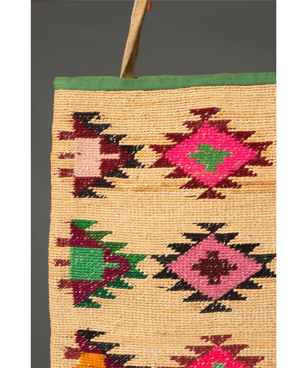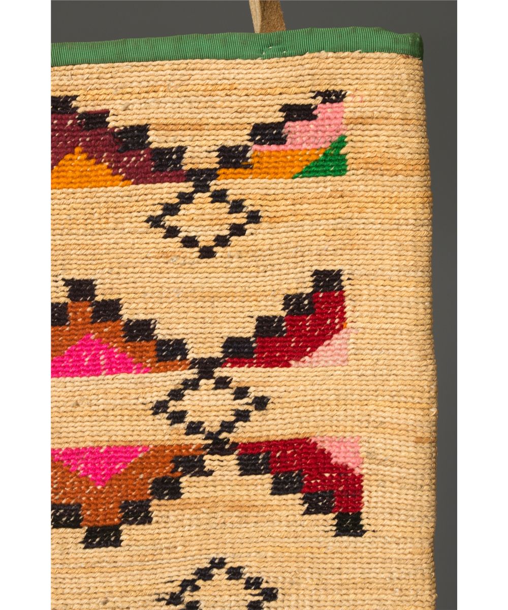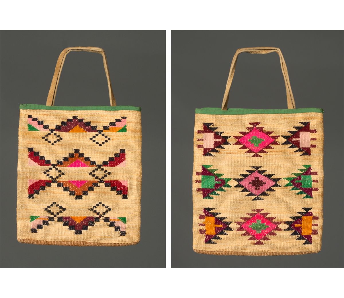 Nez Perce Corn Husk Bag. 12" x 10.5". Wool embroidered designs. Cloth trim and hide handle. Circa 1940s. Provenance: Golden Eagle Trading Co.