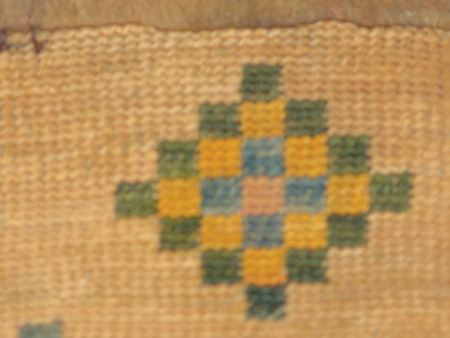 Ca. 1940s, A wonderful fine weave vintage two-sided bag with diamonds on one side, feathers and arrows on the other side, and with leather trim and handle. Good condition, some fading, shows a lot of use. Design made with husk. 7" x 6"