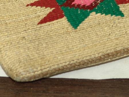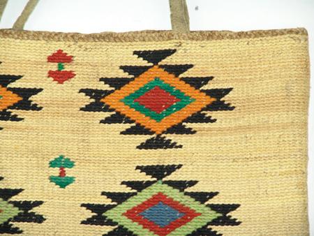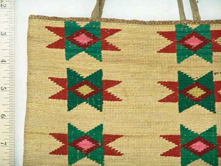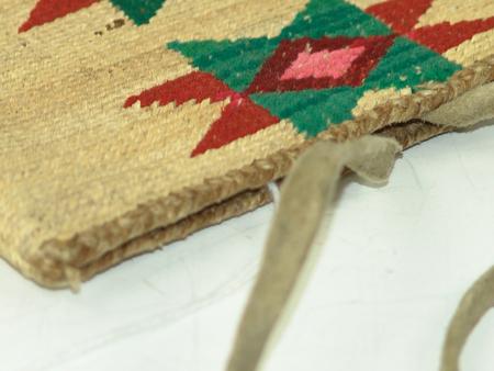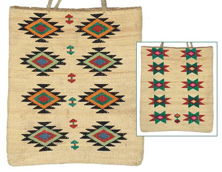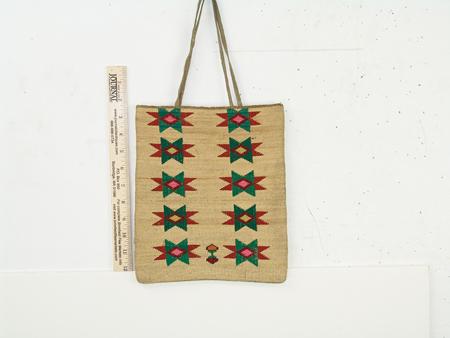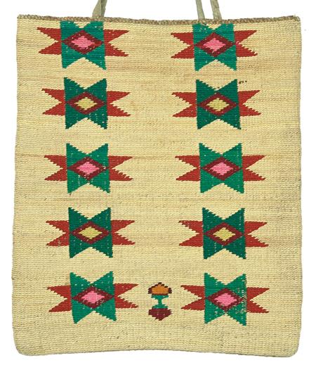 Circa Early/Mid 1900s, Classic fine weave flat bag made with cornhusk twist and different geometric symbols on each side done with wool. Very good condition. 10" x 9" From the Johnson Collection.