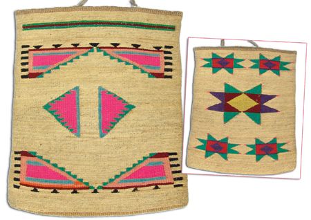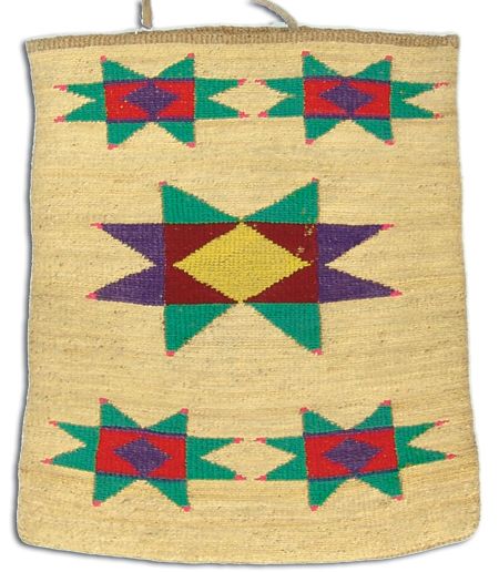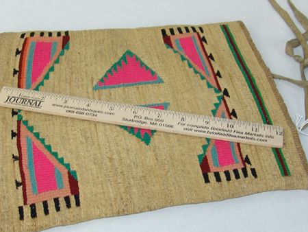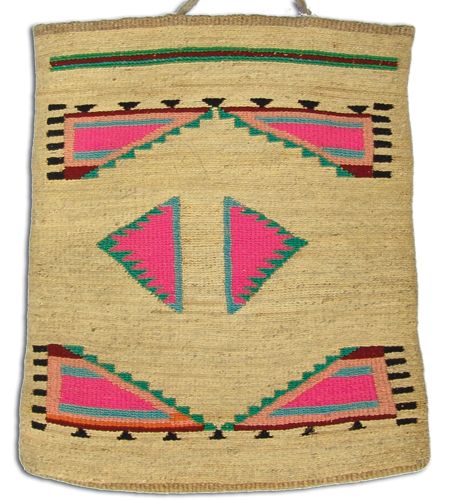 Ca. 1910, Early finer weave ladies' bag with striking geometric designs on both sides done in wool. Very good condition, minor moth grazing. 13-1/4" x 11-1/4"