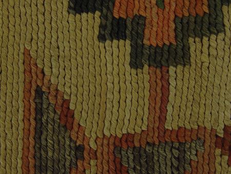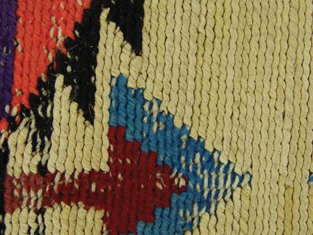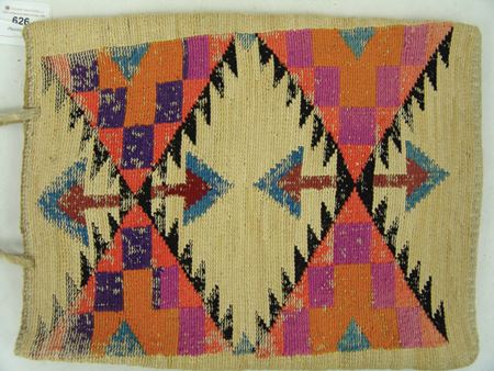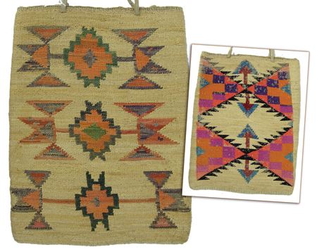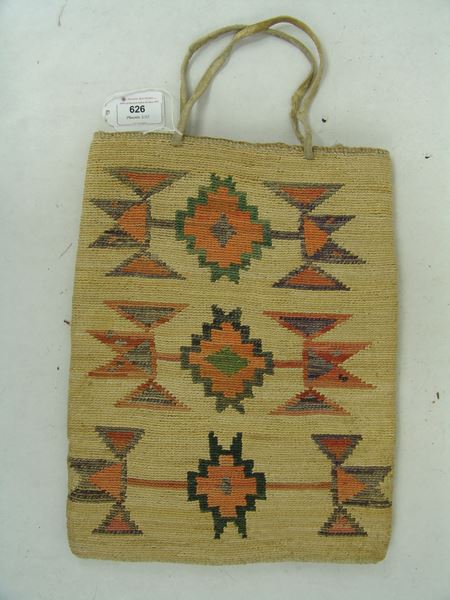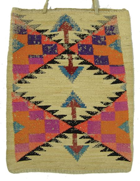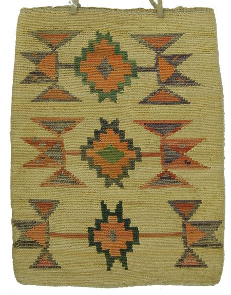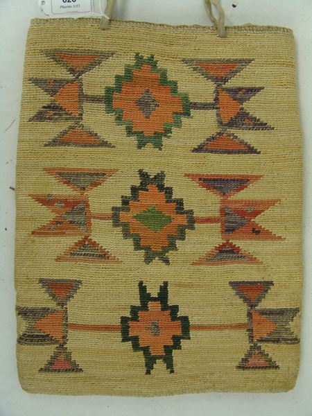 Early/Mid 1900s, Small two-sided woven husk bag with dyed husk geometric designs on one side, woolens on the other. Very good condition on the husk side, the other is missing a lot of the wool. 12-3/4" x 9-3/4"