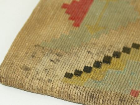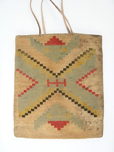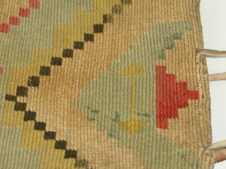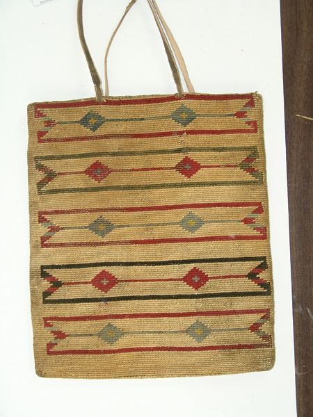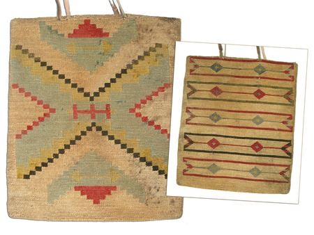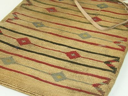 Ca. 1920s, Smaller fine weave bag with different geometrics on each side, done with old wool. Good condition, shows use. 11" x 9-1/2"