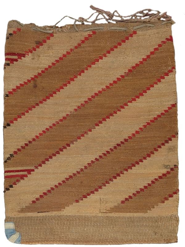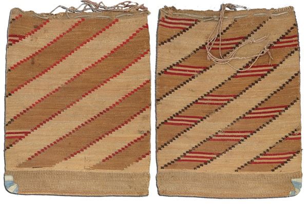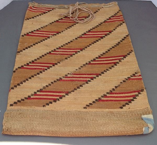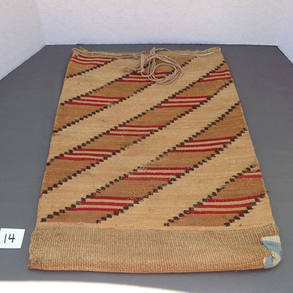 Ca. 1940s 23' x 17" Traditional, two-sided finely woven cornhusk flat bag with similar diagonal bands on both sides. Good condition, one native repair on the corner.