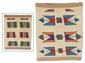 Large traditional 2-sided woven husk bag with colorful geometric design woven in wool; excellent condition. 17" x 13-1/2"
